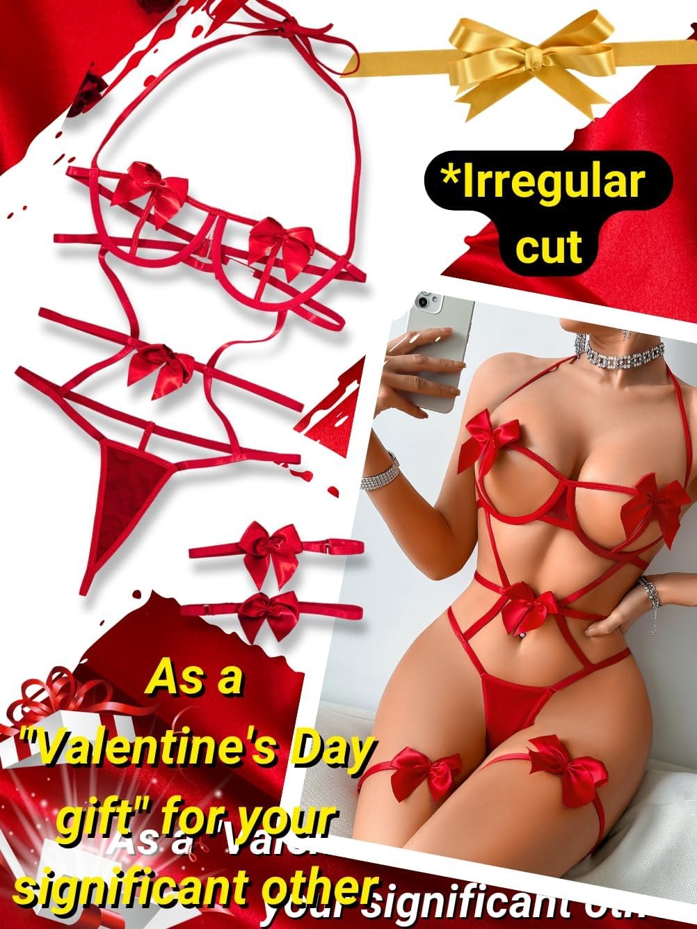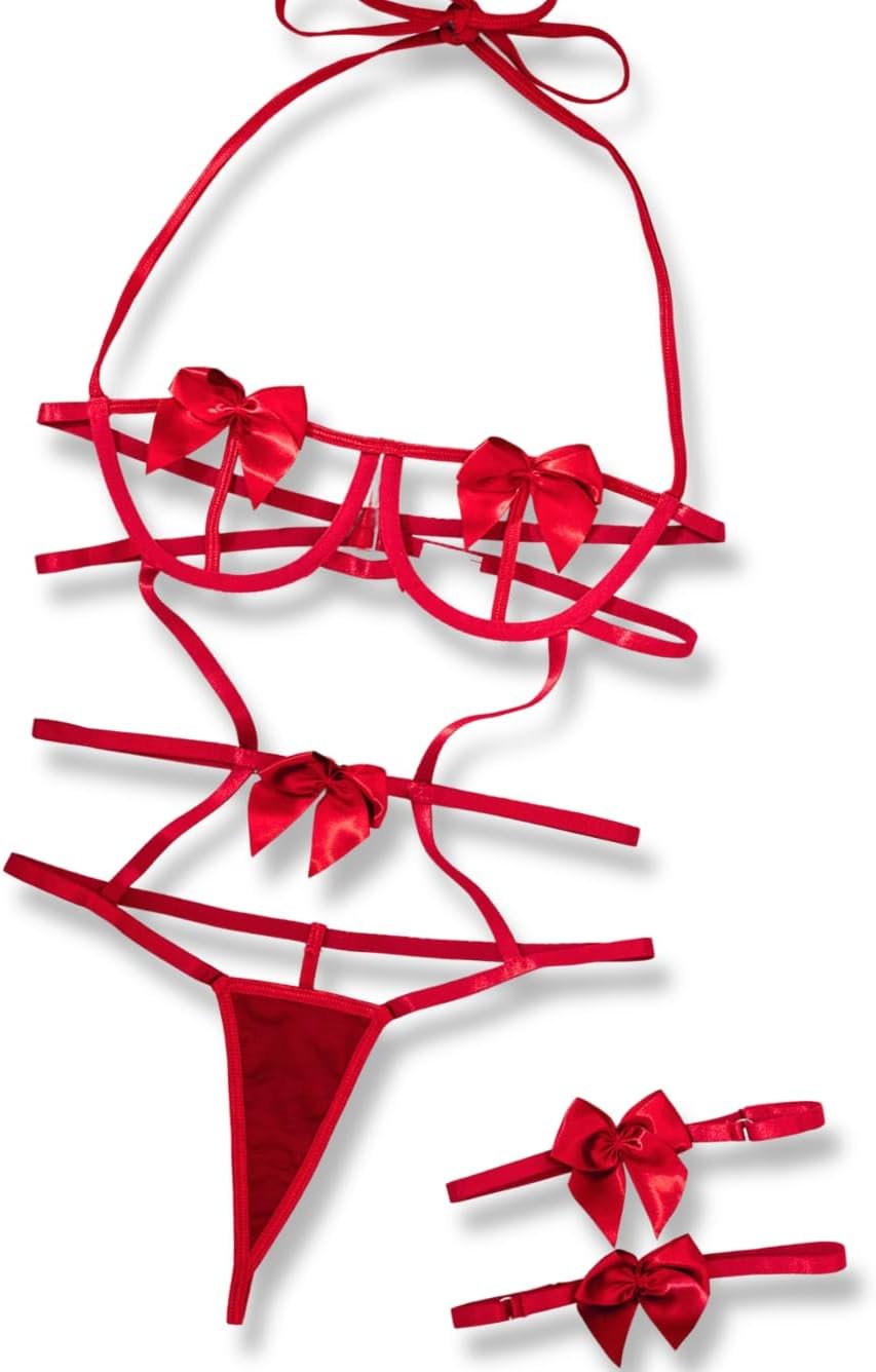 Kaei&Shi Bow Lingerie Set For Christmas,Women Strappy Cutout Lingerie Bodysuit