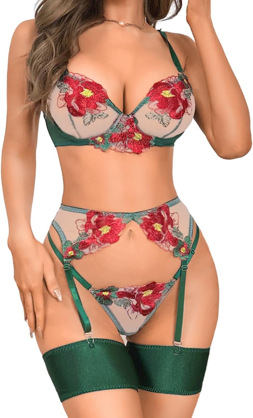 Kaei&Shi Floral Embroidered Garter Belt Set,Sheer Lingerie Sets for Women Sexy,Wedding Night Valentines Boudoir Outfits