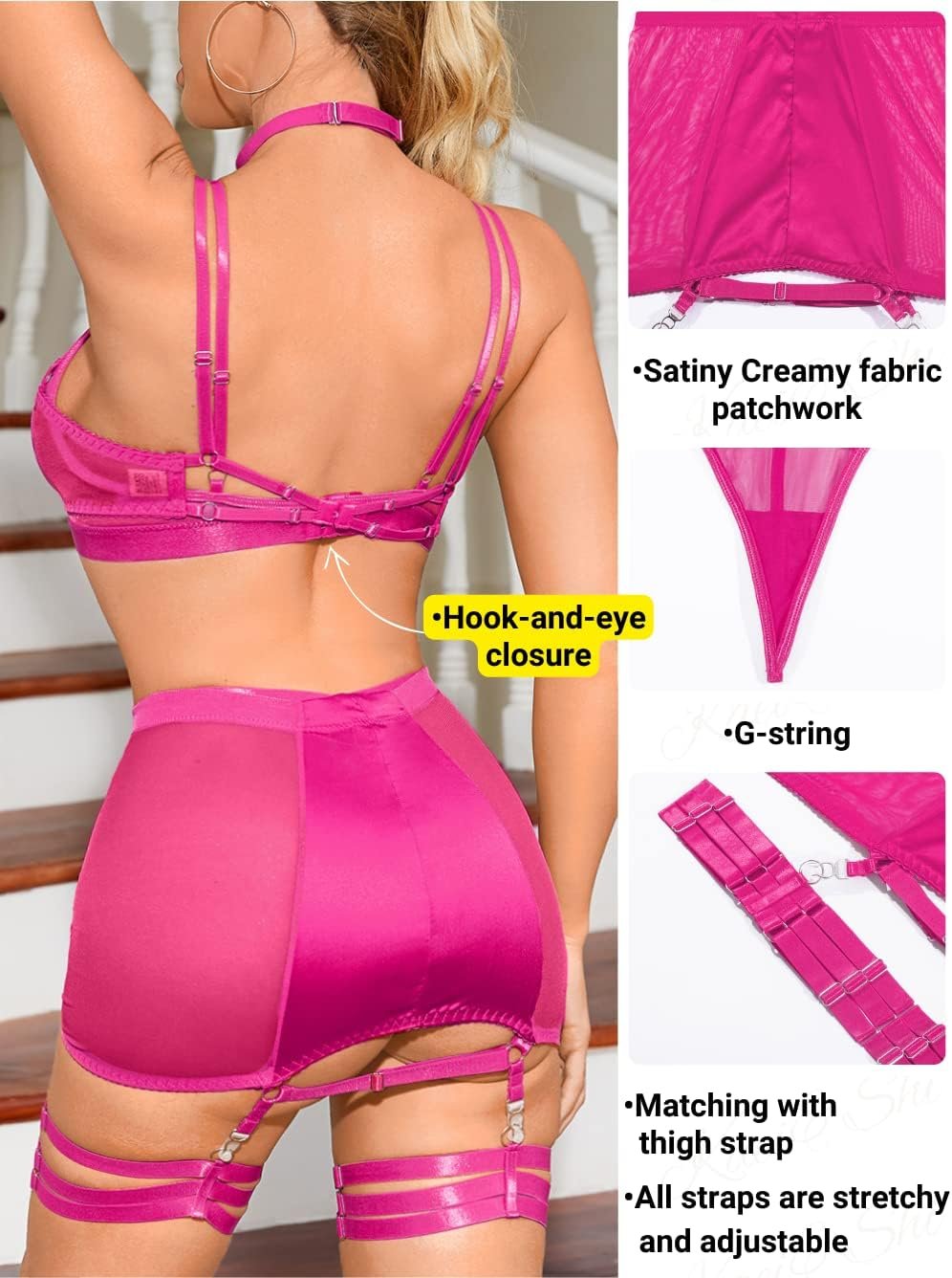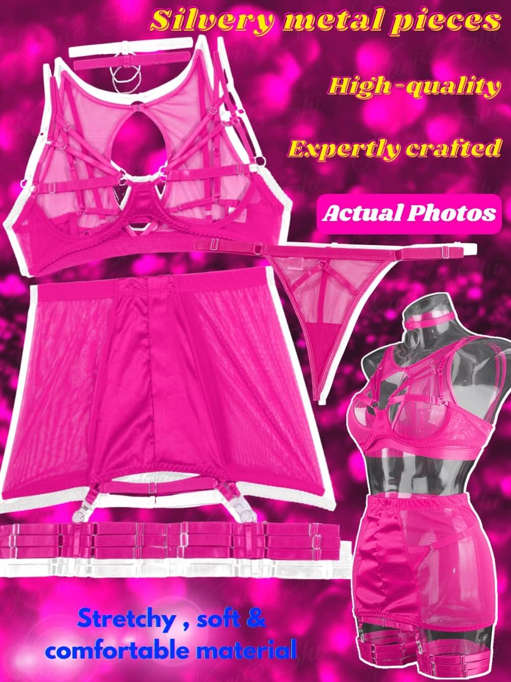 Kaei&Shi Garter Lingerie for Women, Strappy High Waisted Skirt G String 4 Piece Sexy Exotic Lingerie Outfits Set Boudoir