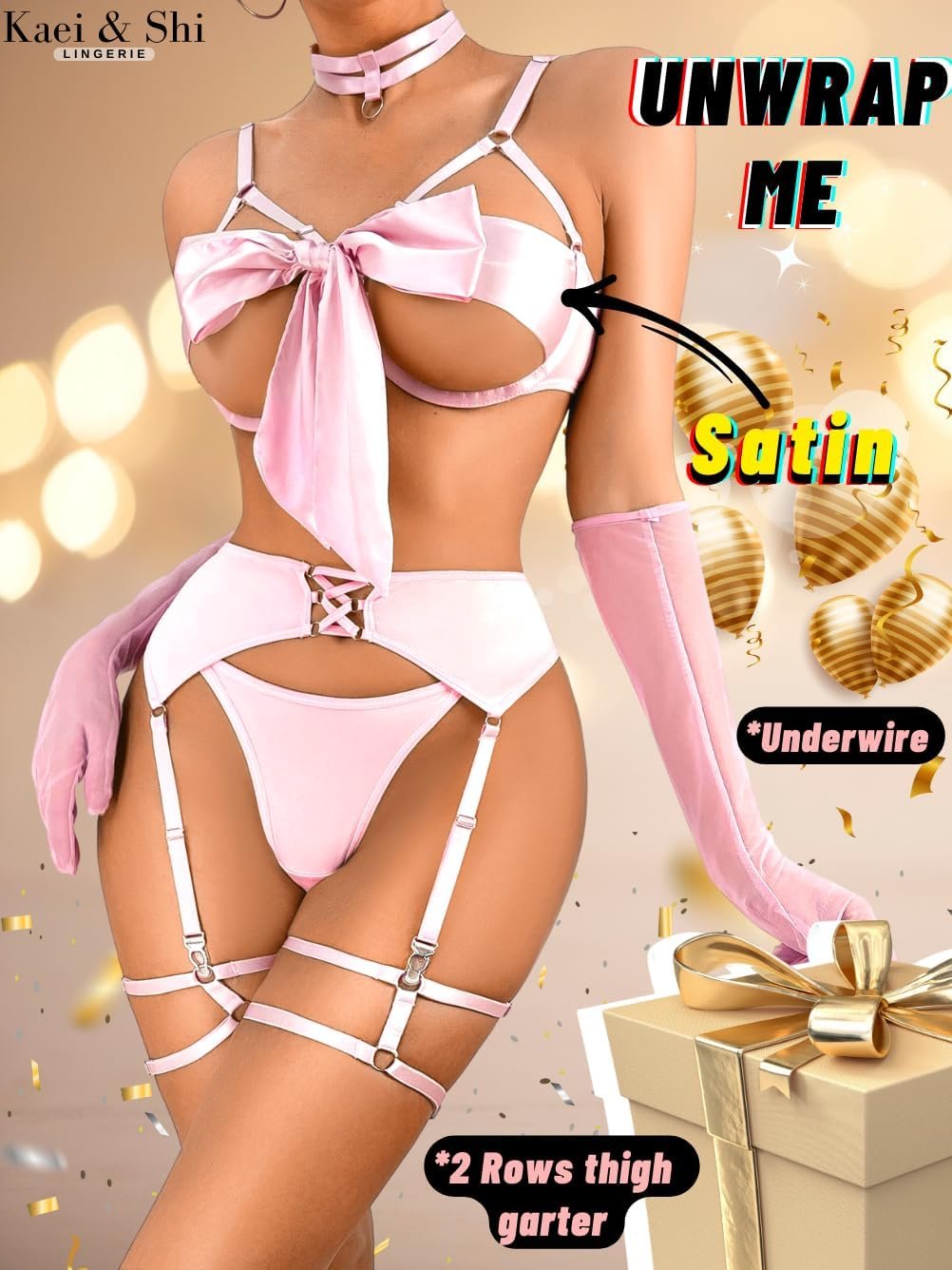 Kaei&Shi Sexy Bow Lingerie for Women,Unwrap Present Bra And Panty Set,Strappy Garter Lingeries Xmas Valentines Birthday Gift