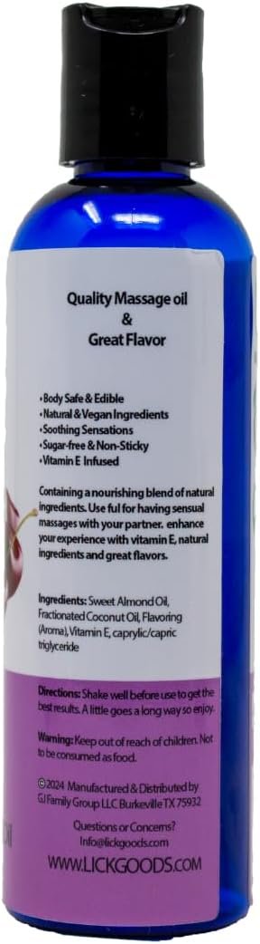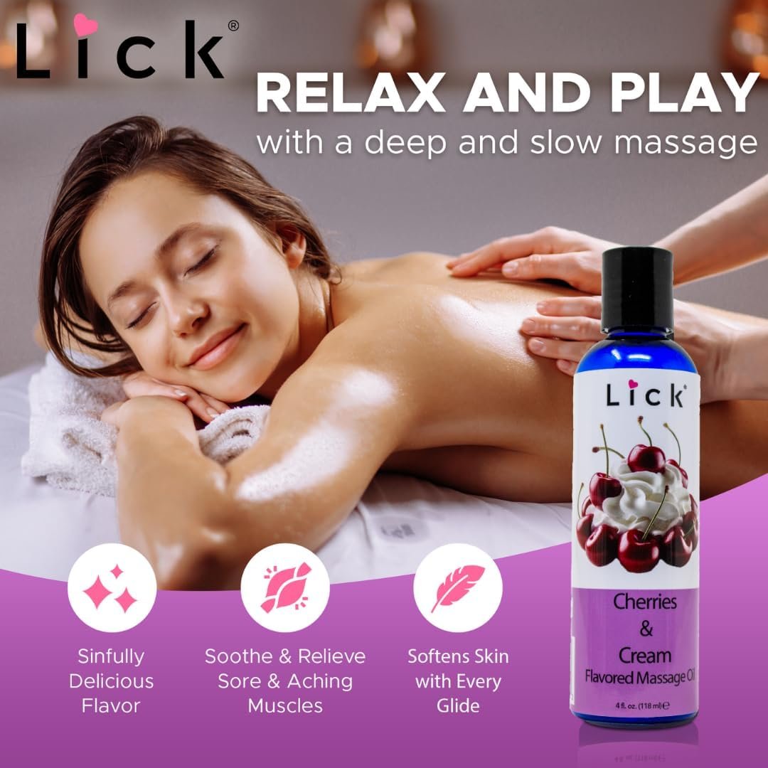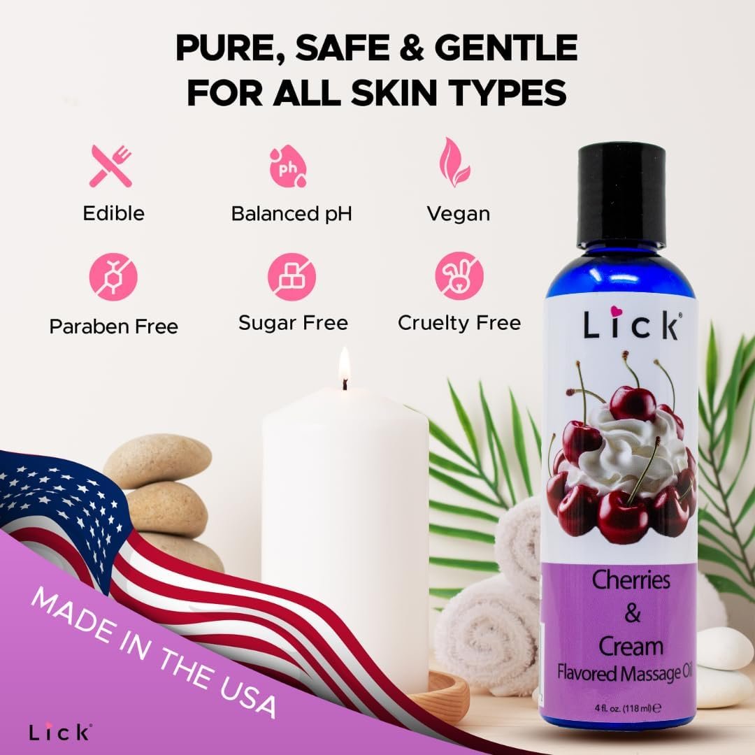 Lick Cherries and Cream Indulgence Flavored Massage Oil – Romantic, Sweet, Non-Sticky, Couples, 4 oz