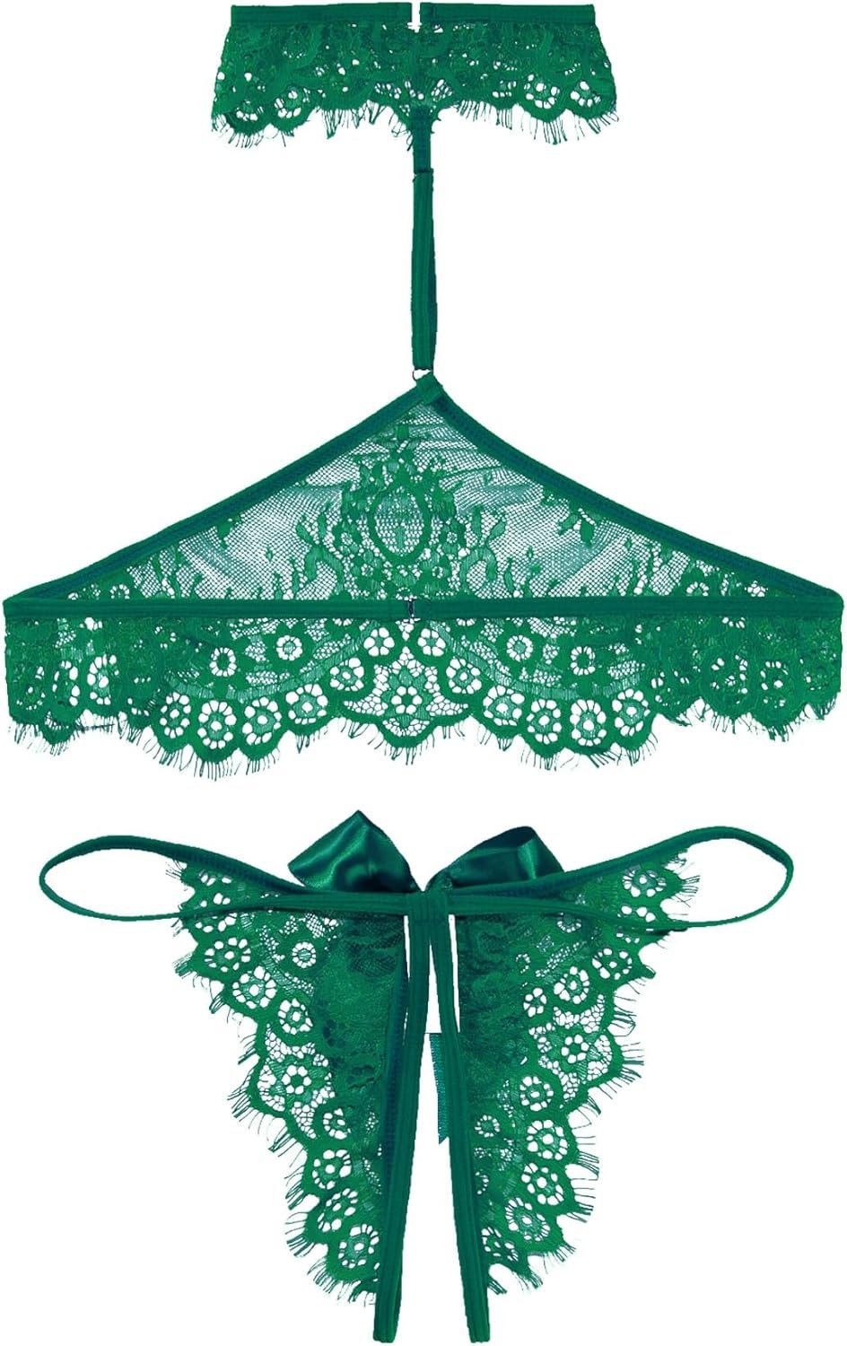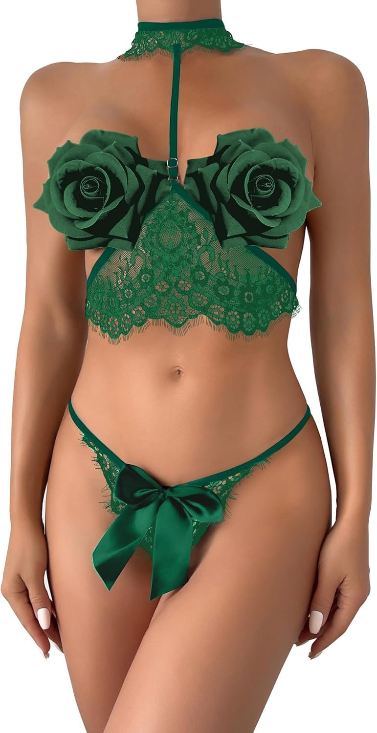 Lilosy Sexy Bow Choker Halter Floral Lace Sheer Lingerie Set for Women See Through Bra and Panty 2 Piece