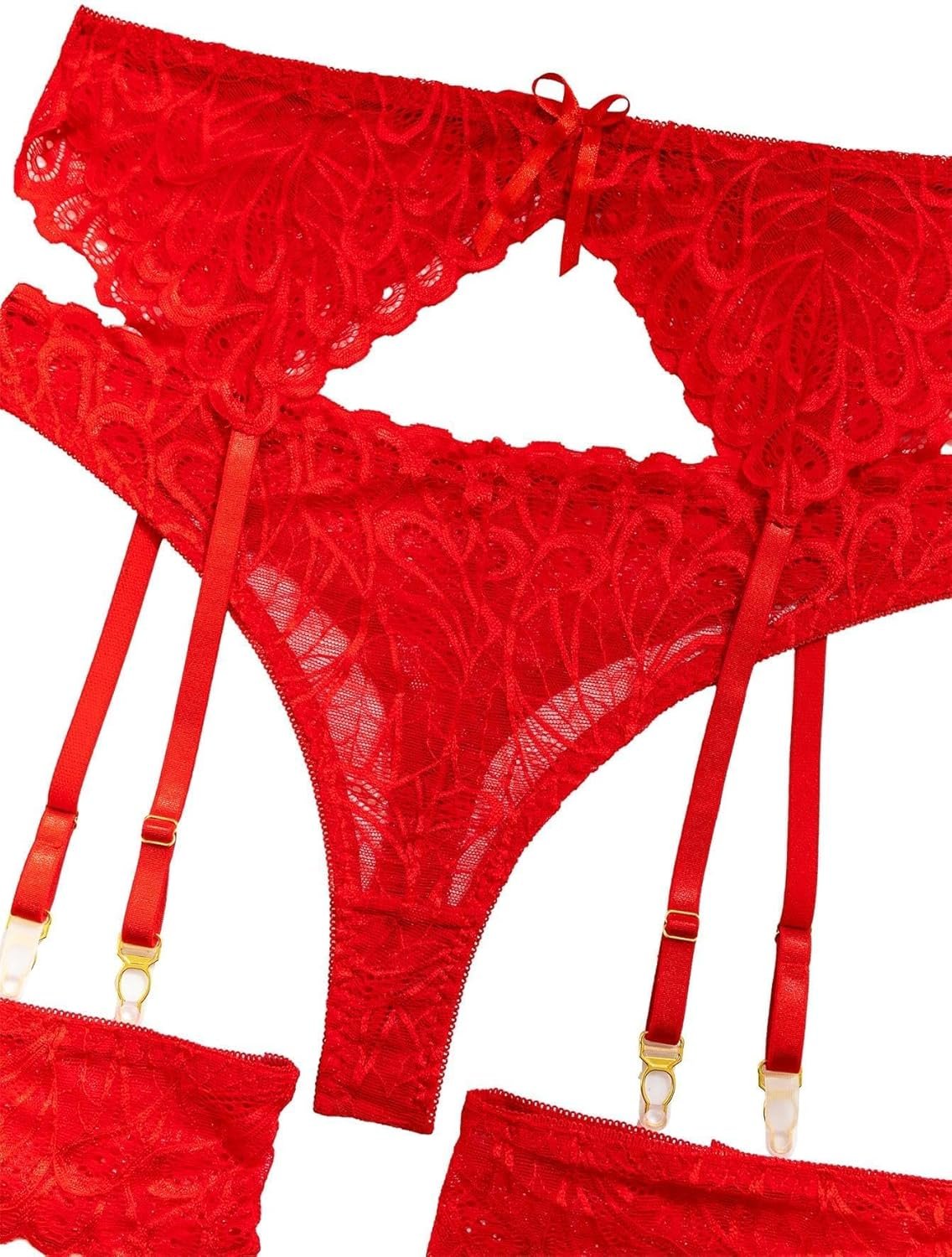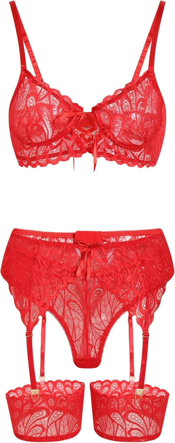 Lilosy Sexy Bow Feather Floral Lace Sheer Underwire Push Up Garter Lingerie Set