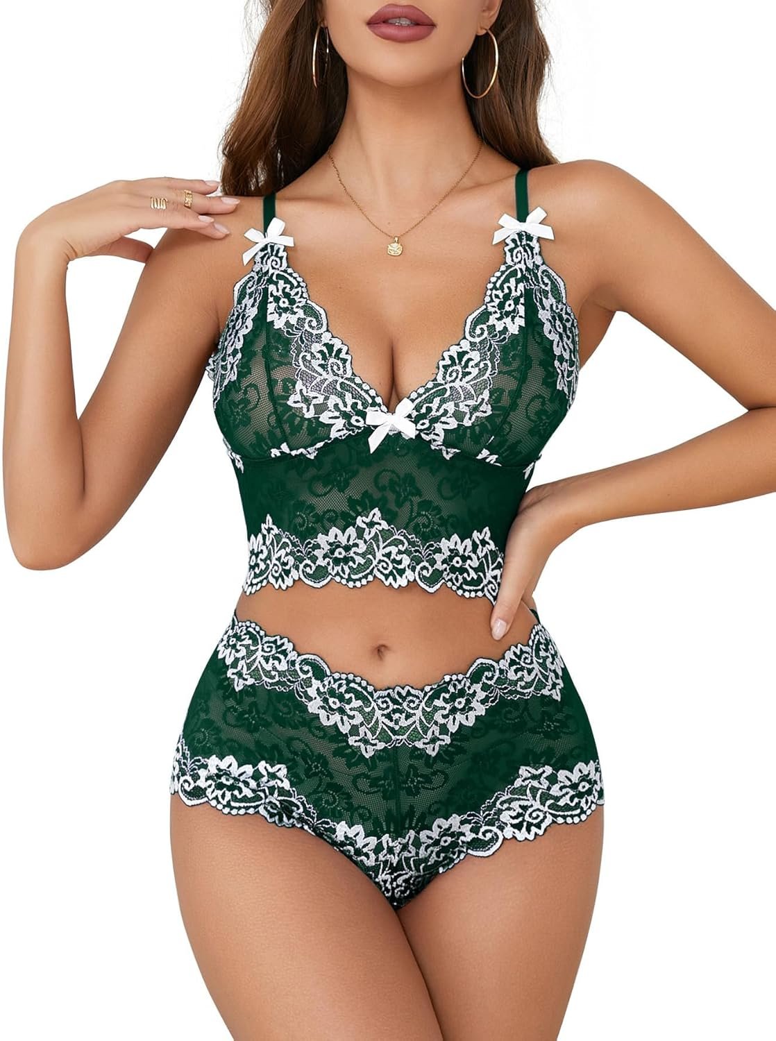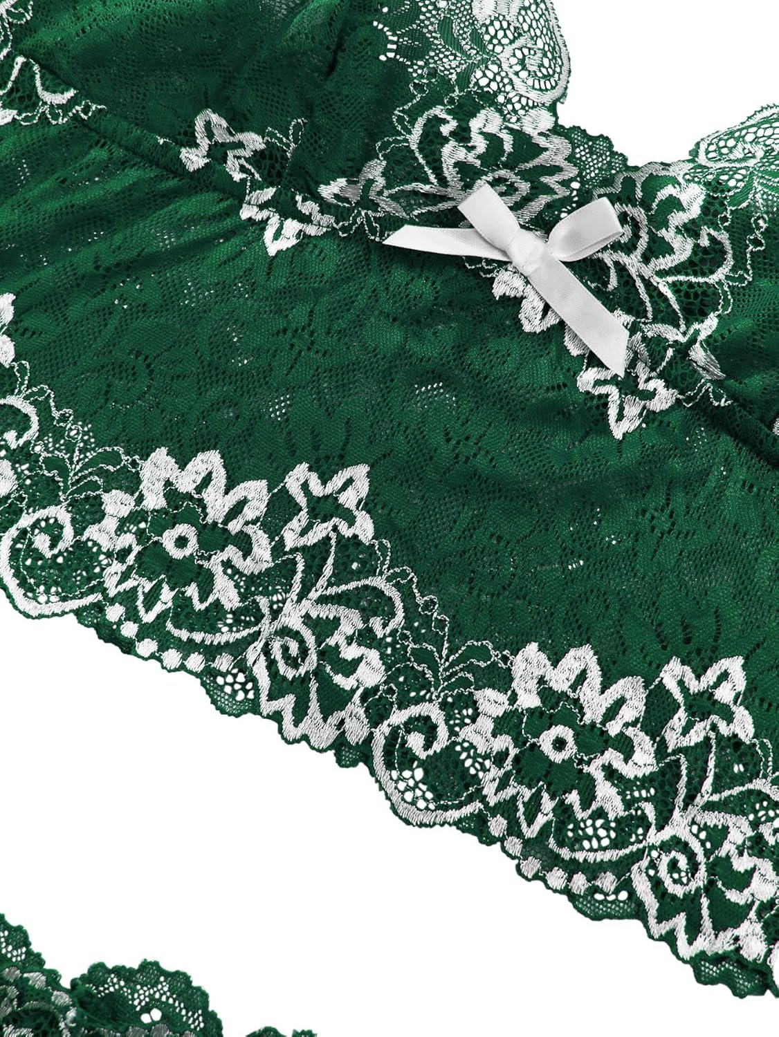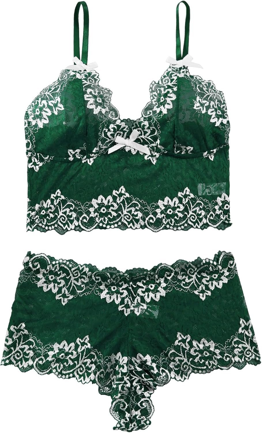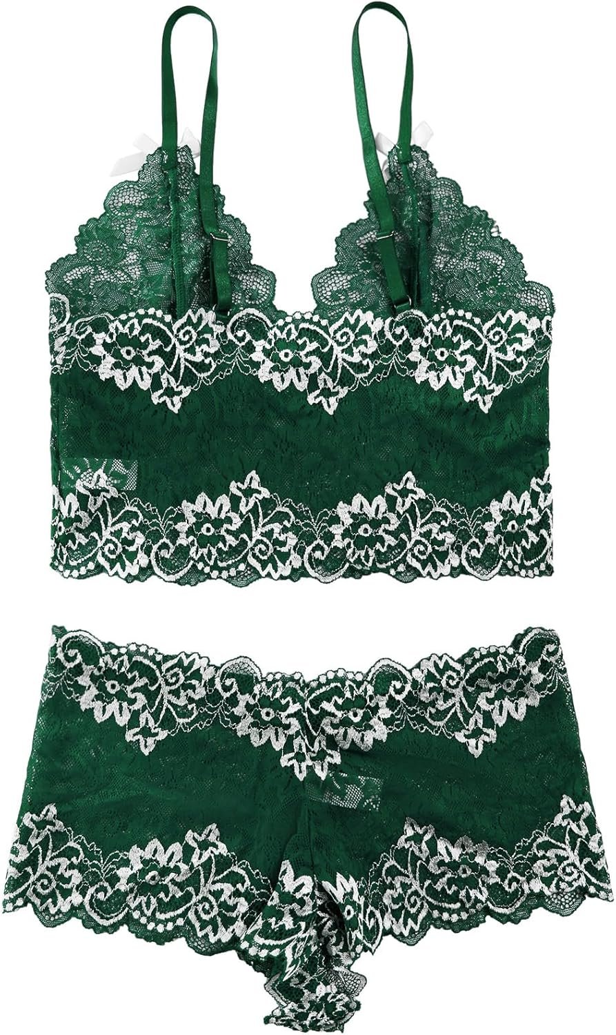 Lilosy Sexy Lace Pajamas Lingerie Set High Waist Sheer Sleepwear Bow Ties Cami Shorts Bra and Panty