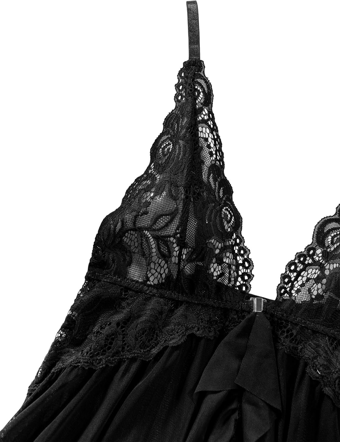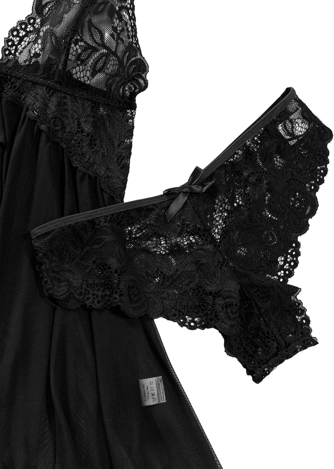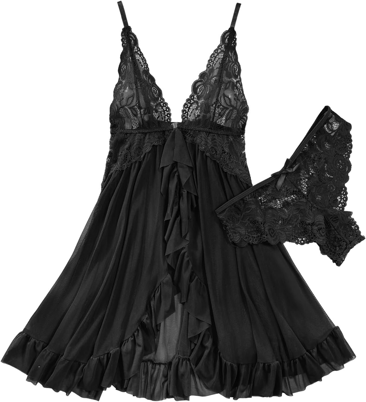 Lilosy Sexy Open Front Closure Floral Lace Mesh Sheer Babydoll Lingerie Dress with Thong 2 Piece