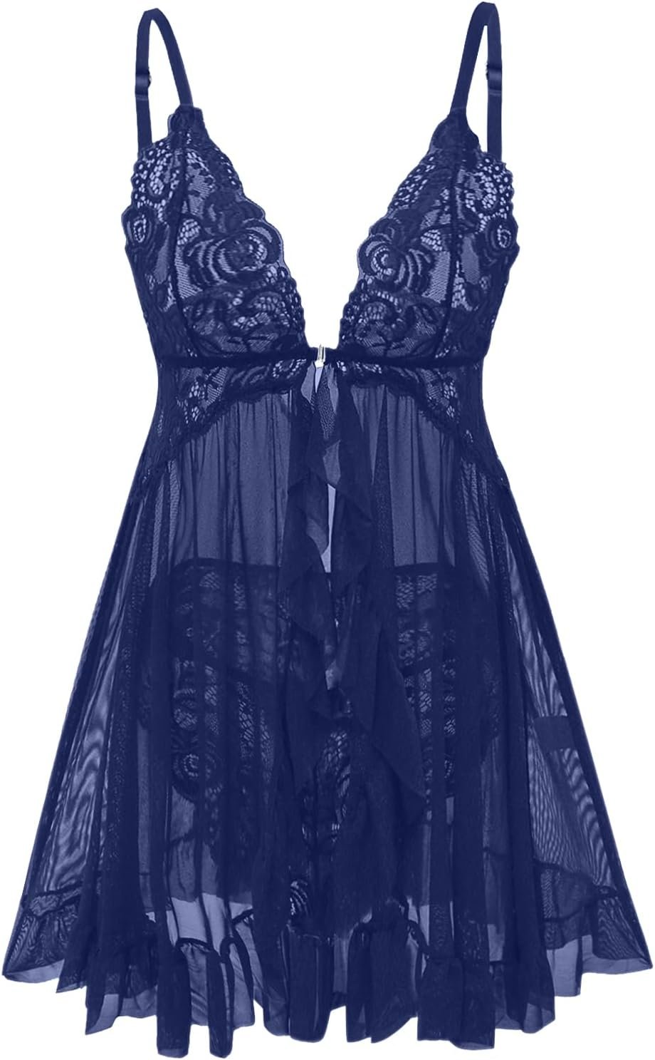 Lilosy Sexy Open Front Closure Floral Lace Mesh Sheer Babydoll Lingerie Dress with Thong 2 Piece