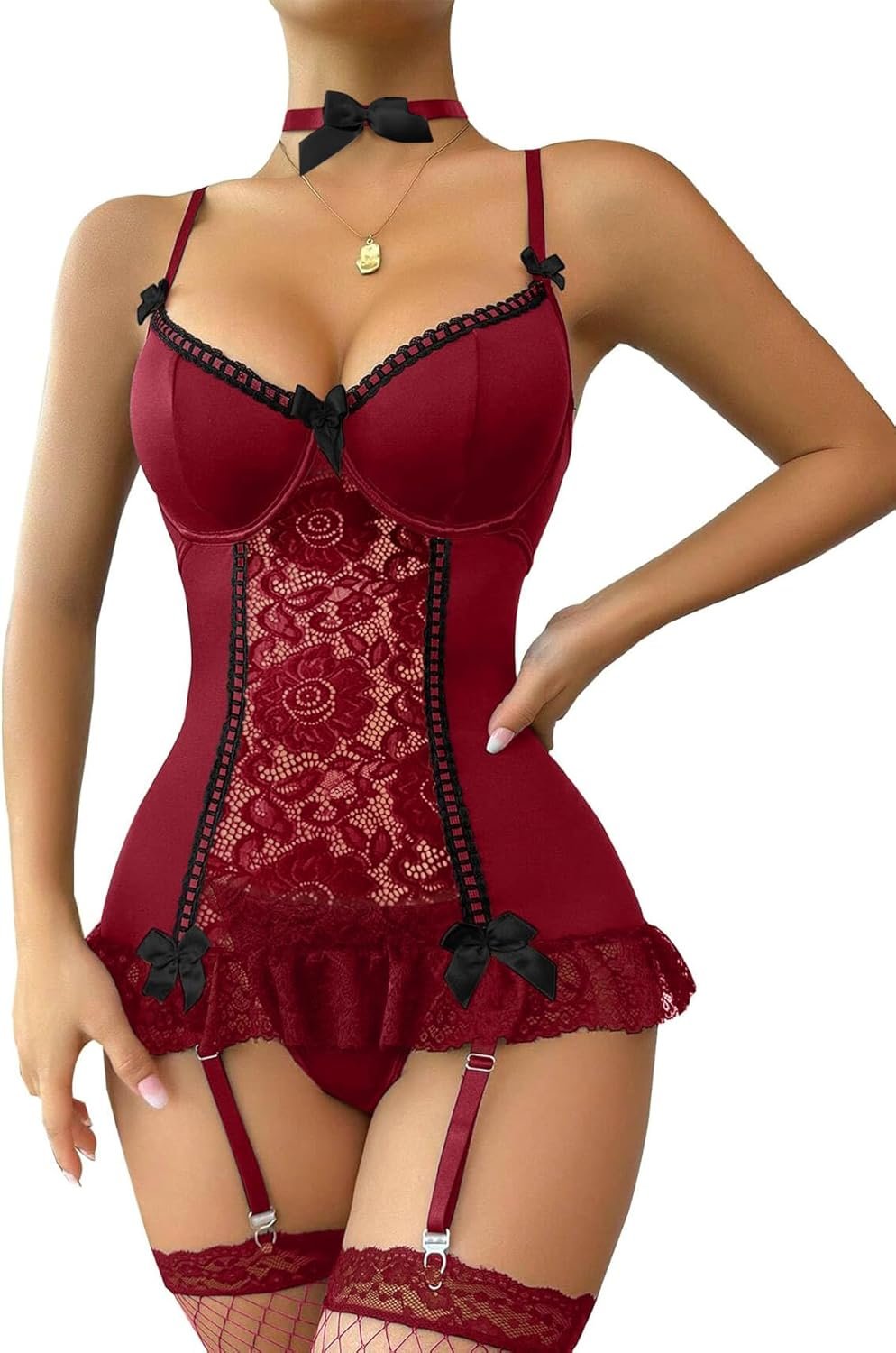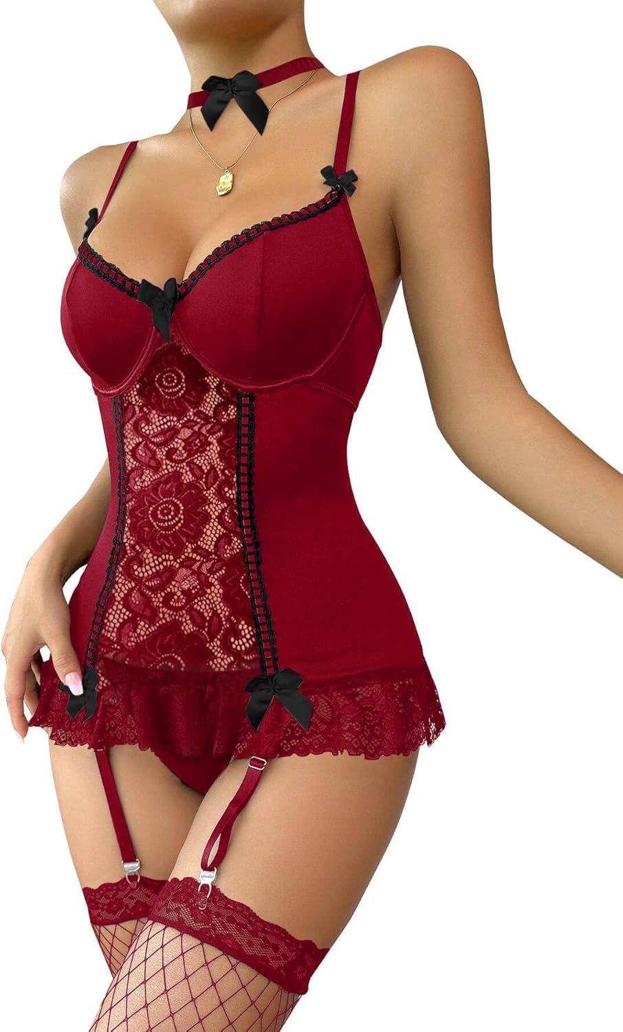 Lilosy Sexy Stocking Garter Belt Bows Floral Lace Babydoll Corset Push Up Teddy Lingerie Set with Panty