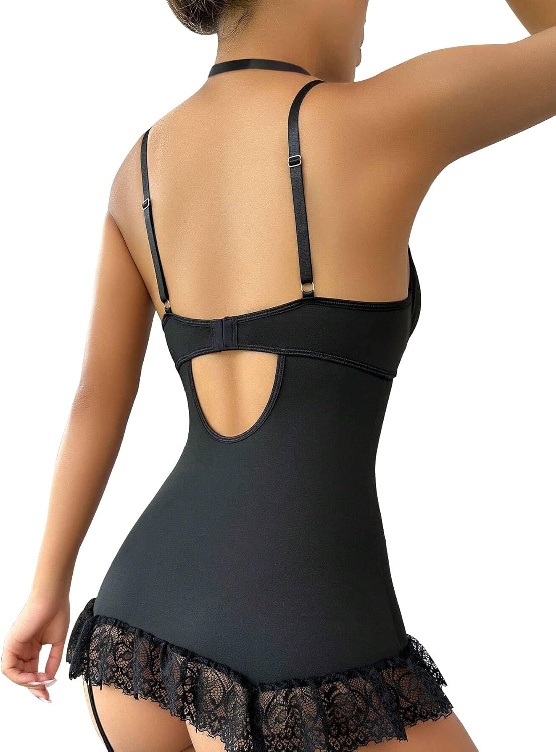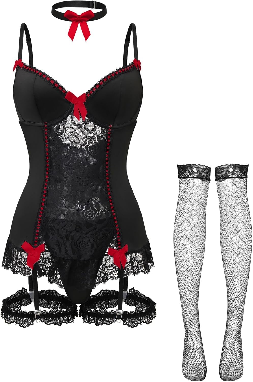 Lilosy Sexy Stocking Garter Belt Bows Floral Lace Babydoll Corset Push Up Teddy Lingerie Set with Panty