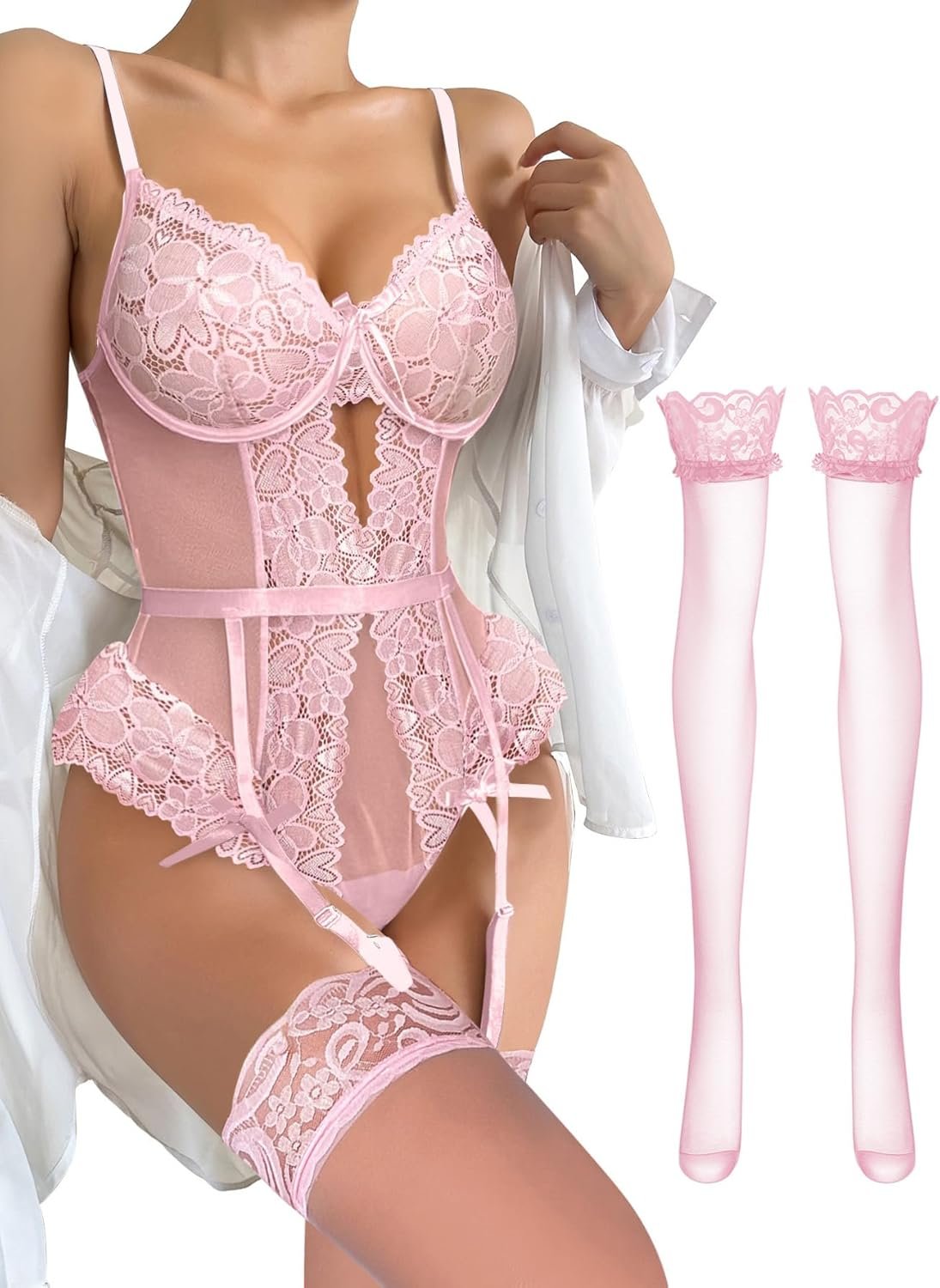 Lilosy Sexy Stocking Lace Mesh Bodysuit Top Underwire Garter Lingerie Set 3 Piece