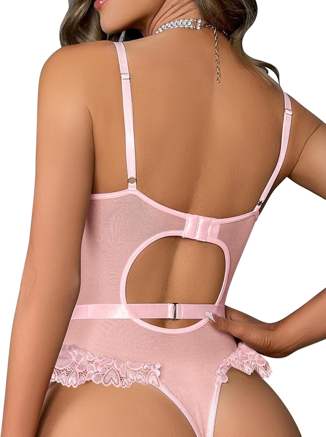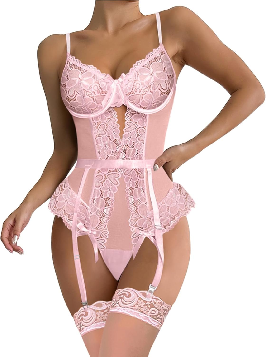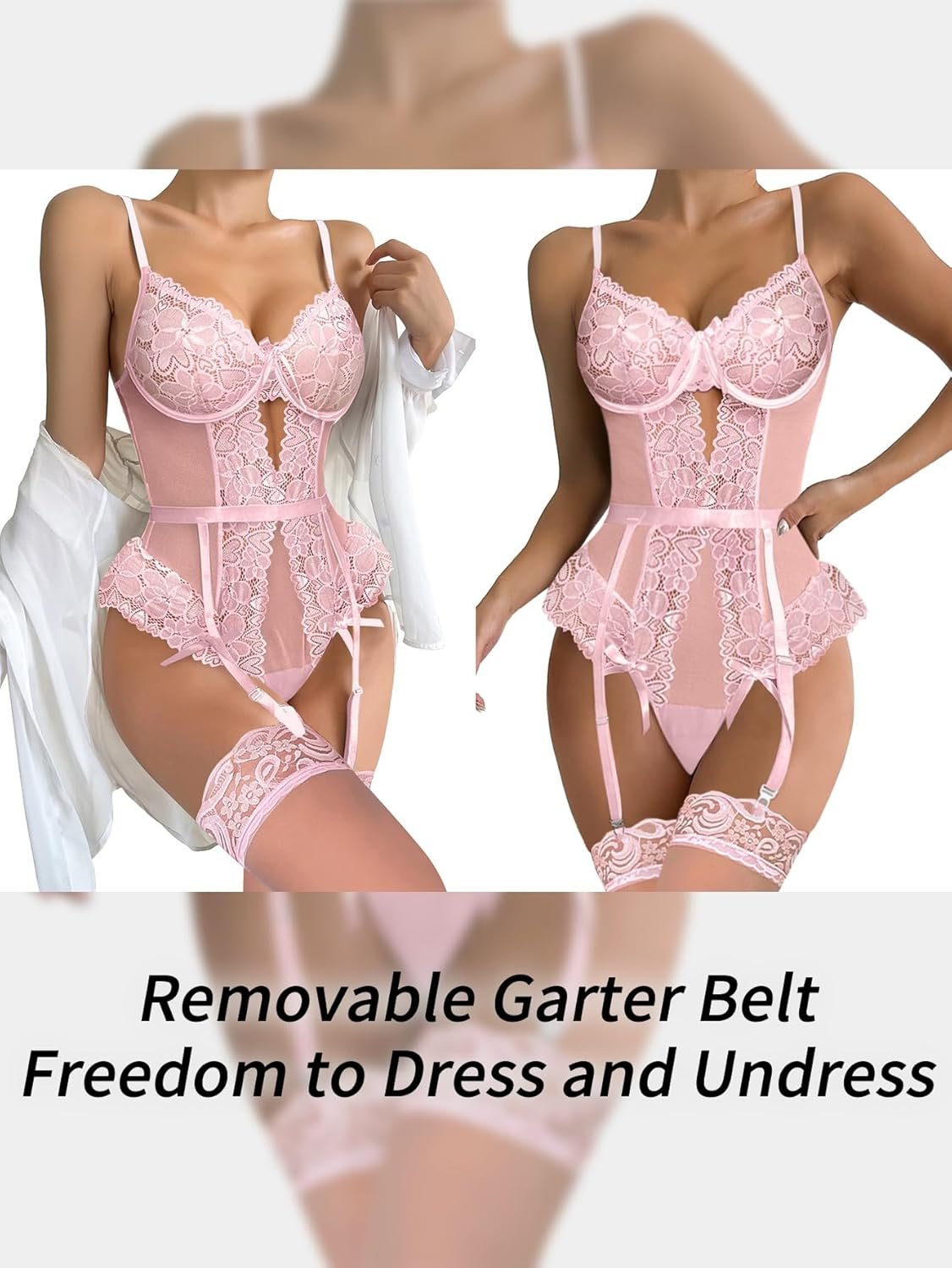 Lilosy Sexy Stocking Lace Mesh Bodysuit Top Underwire Garter Lingerie Set 3 Piece