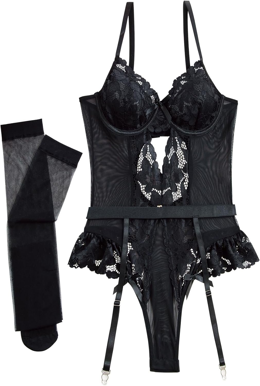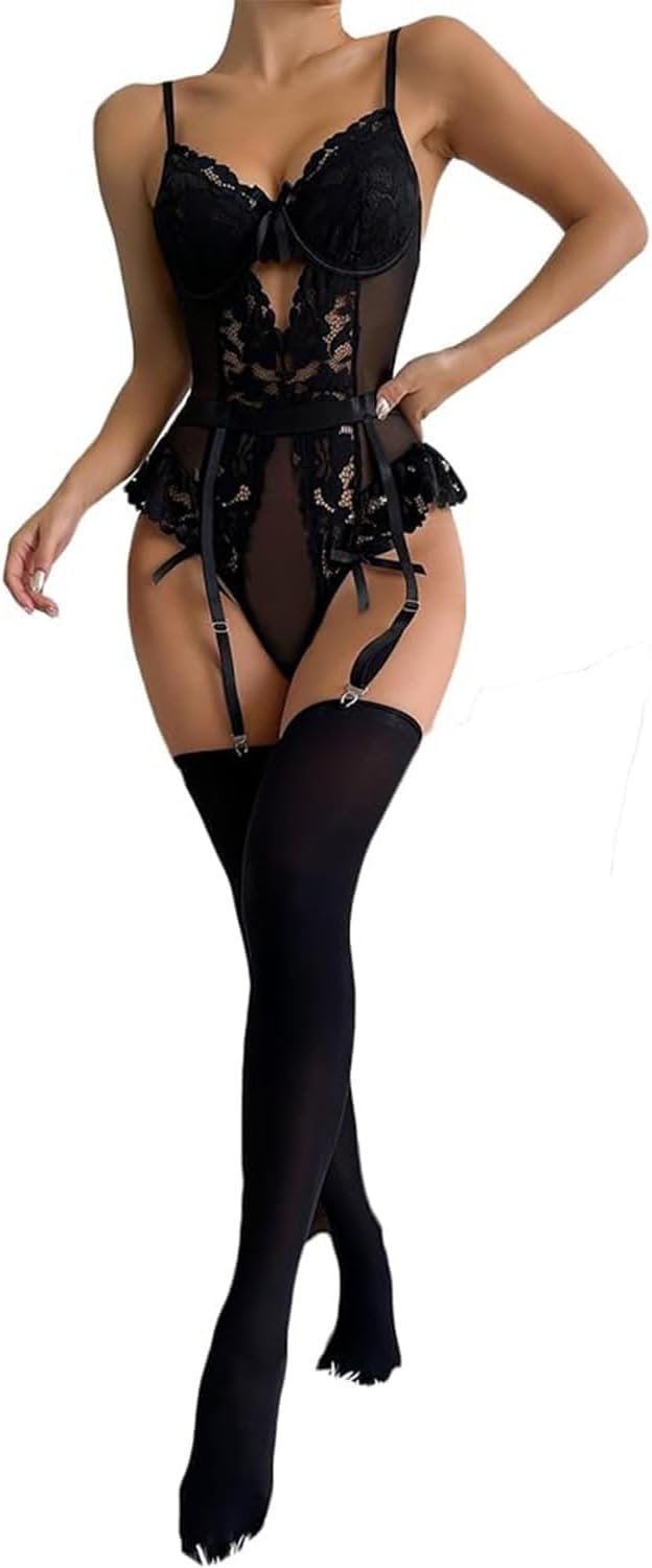 Lilosy Sexy Stocking Lace Mesh Bodysuit Top Underwire Garter Lingerie Set 3 Piece