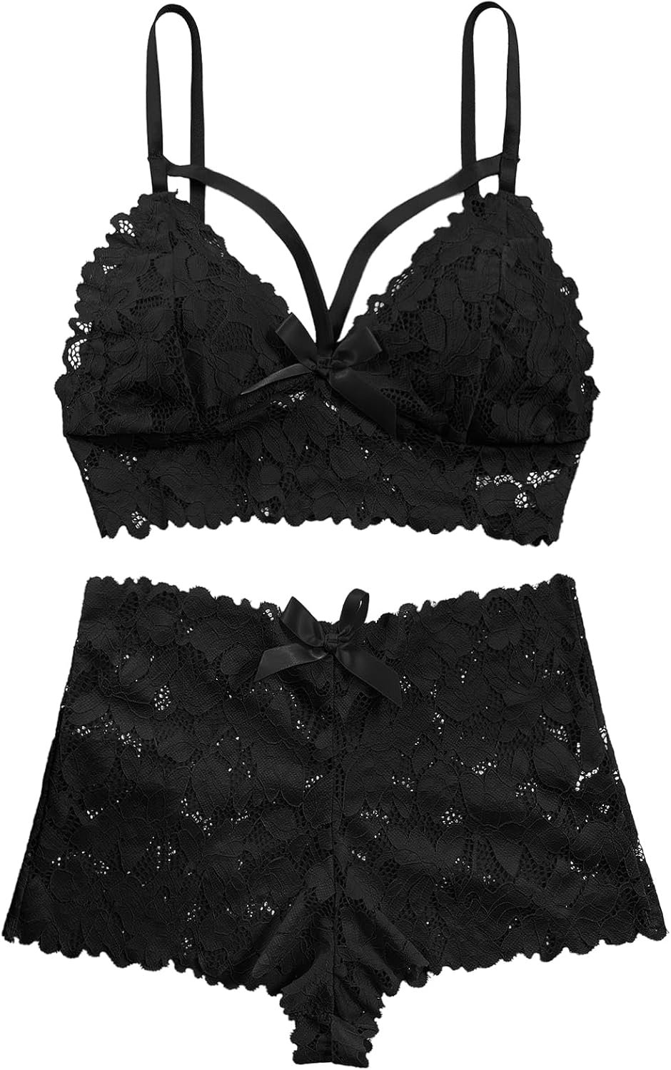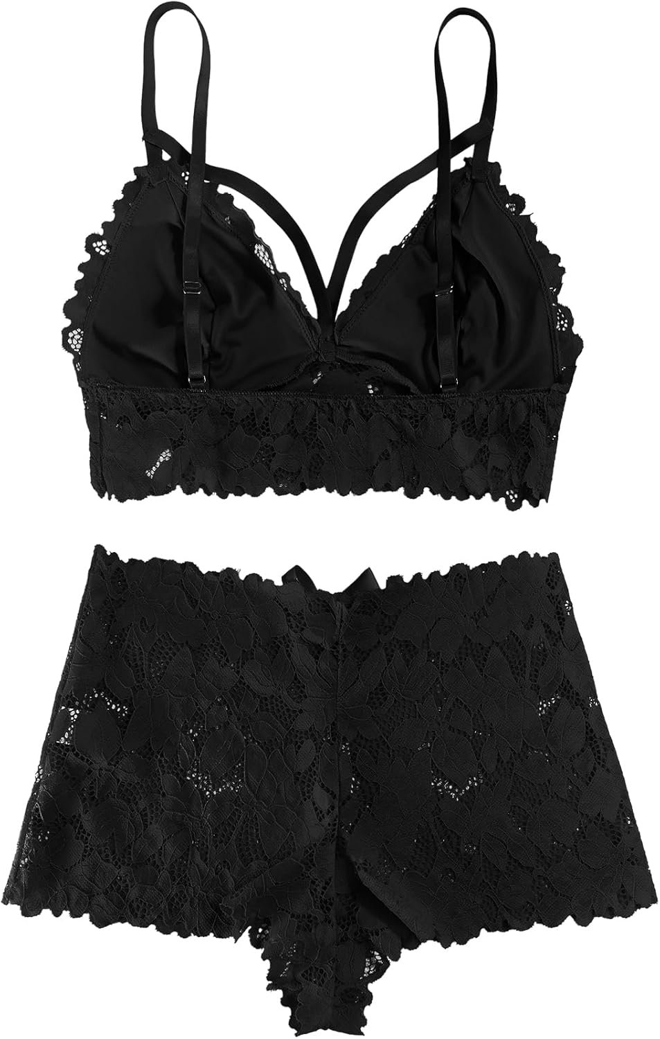 Lilosy Sexy Strappy High Waist Floral Lace Pajamas Lingerie Set Outfits