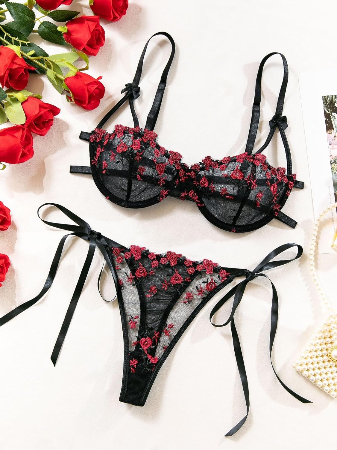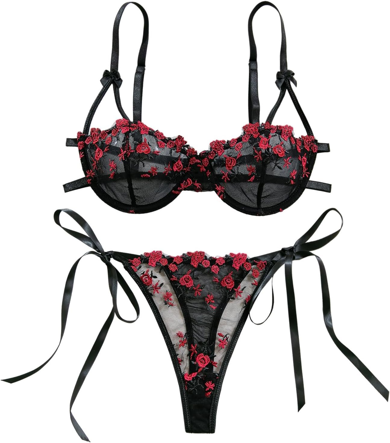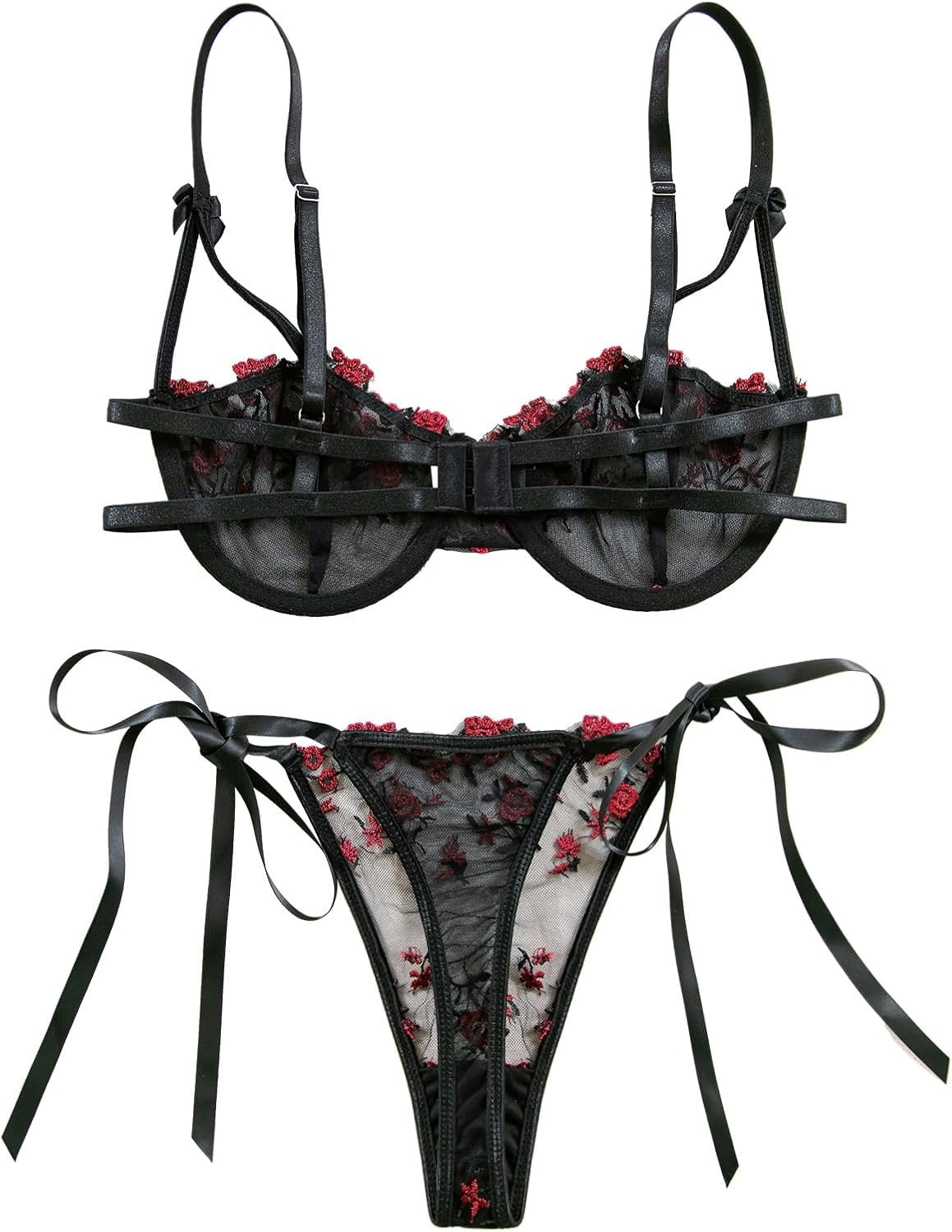 Lilosy Sexy Tie Side Cute Underwire Push Up Strappy Embroidered Mesh Sheer Lingerie Set