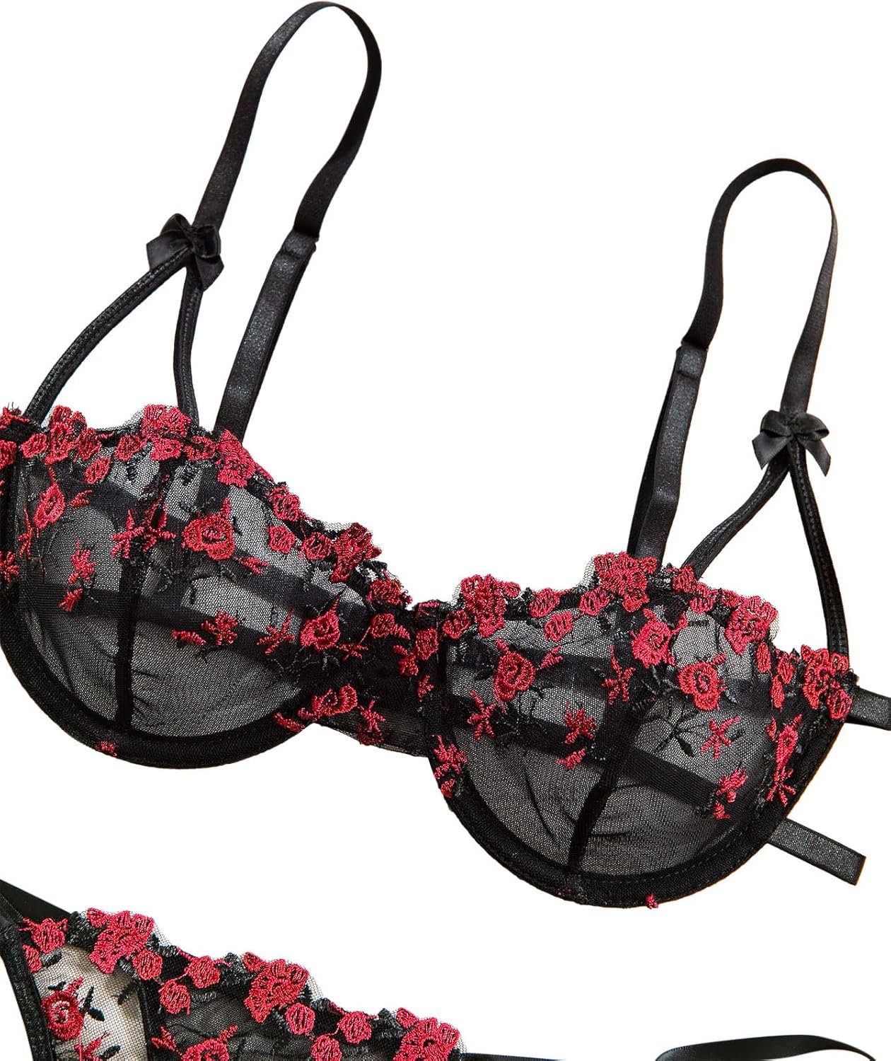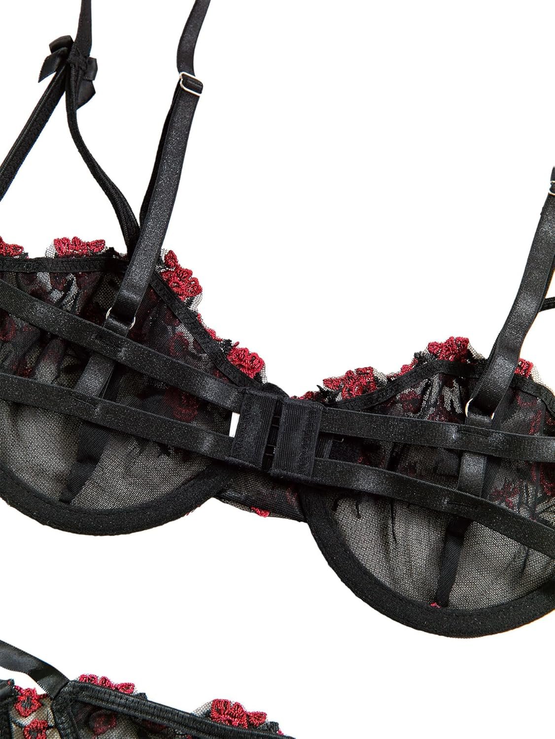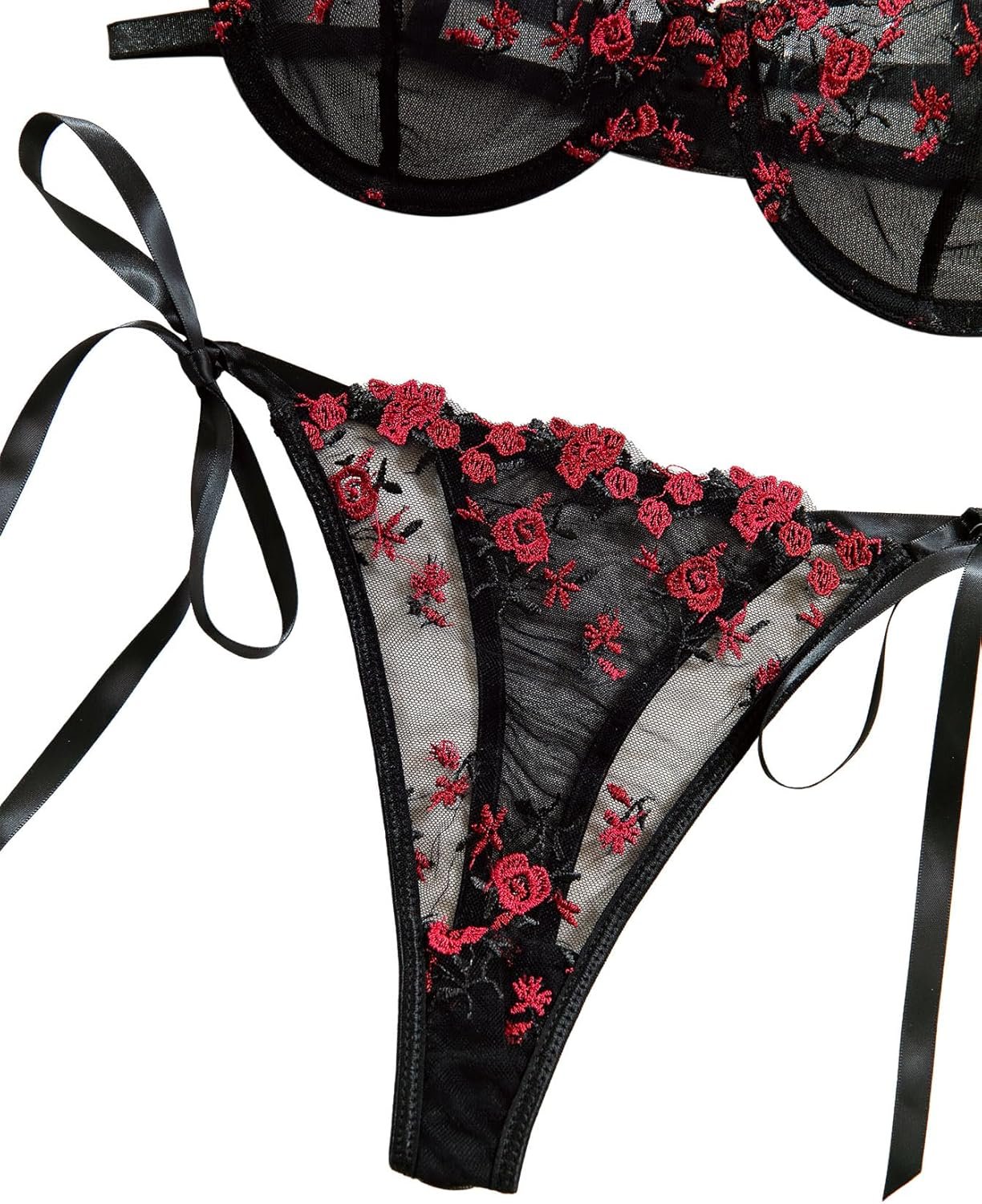 Lilosy Sexy Tie Side Cute Underwire Push Up Strappy Embroidered Mesh Sheer Lingerie Set