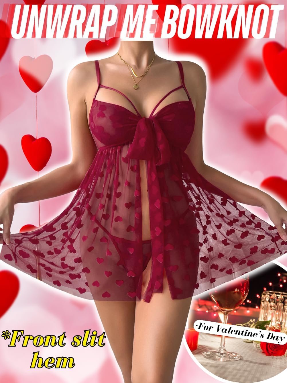 Lingerie For Women Sexy, Unwrap Me Bow Heart Babydoll Valentines, Sheer Sleepwear Exotic Burgundy Small