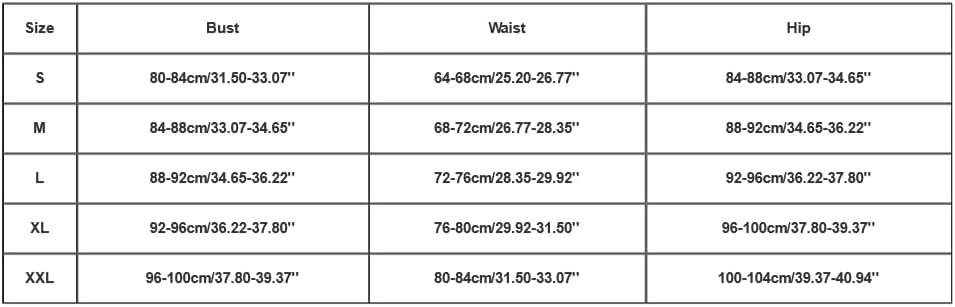 Bust: 96-100cm/37.80-39.37” Waist: 80-84cm/31.50-33.07” Hip: 100-104cm/39.37-40.94”