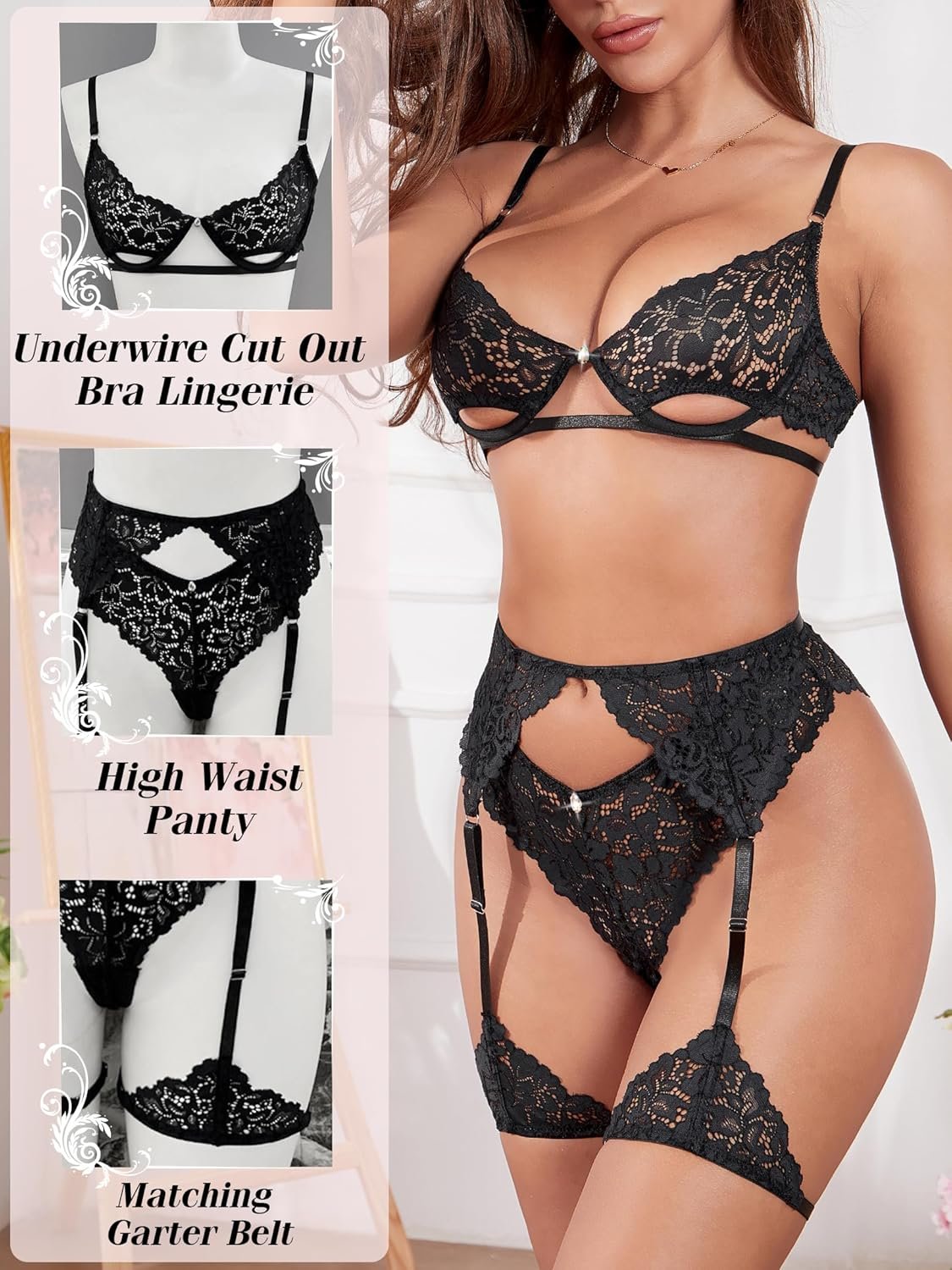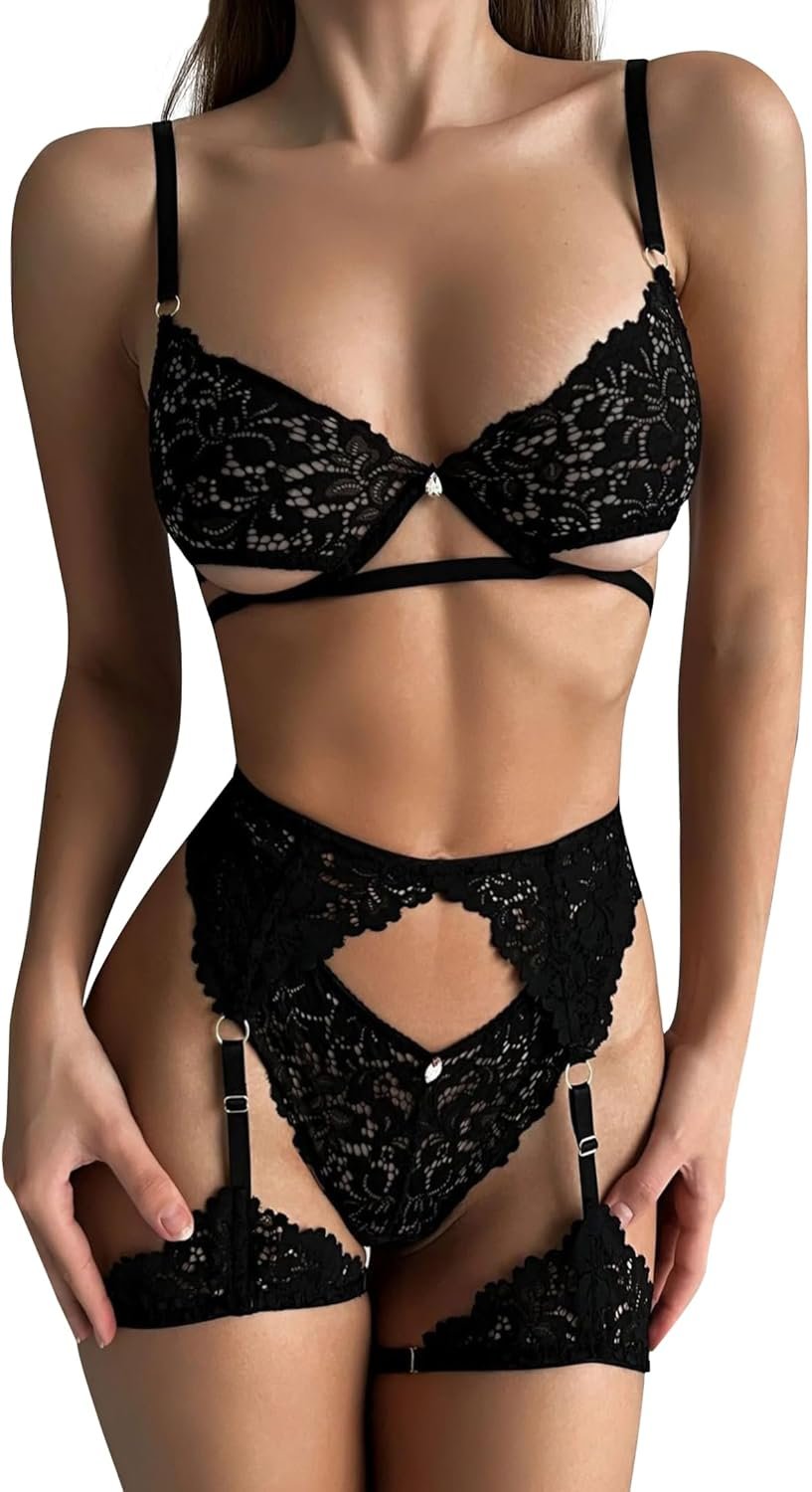 Lingerie Sets for Women Sexy,Lace Floral Lingerie Set with Garter Belt 3 Piece Sexy Bra and Panty Sets