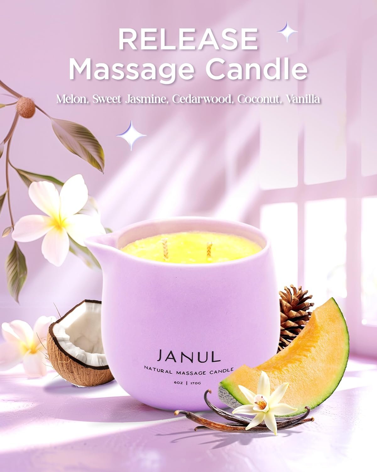 Indulge in Pure Relaxation with the JANUL Luxury Melon & Jasmine Scented Massage Candle.