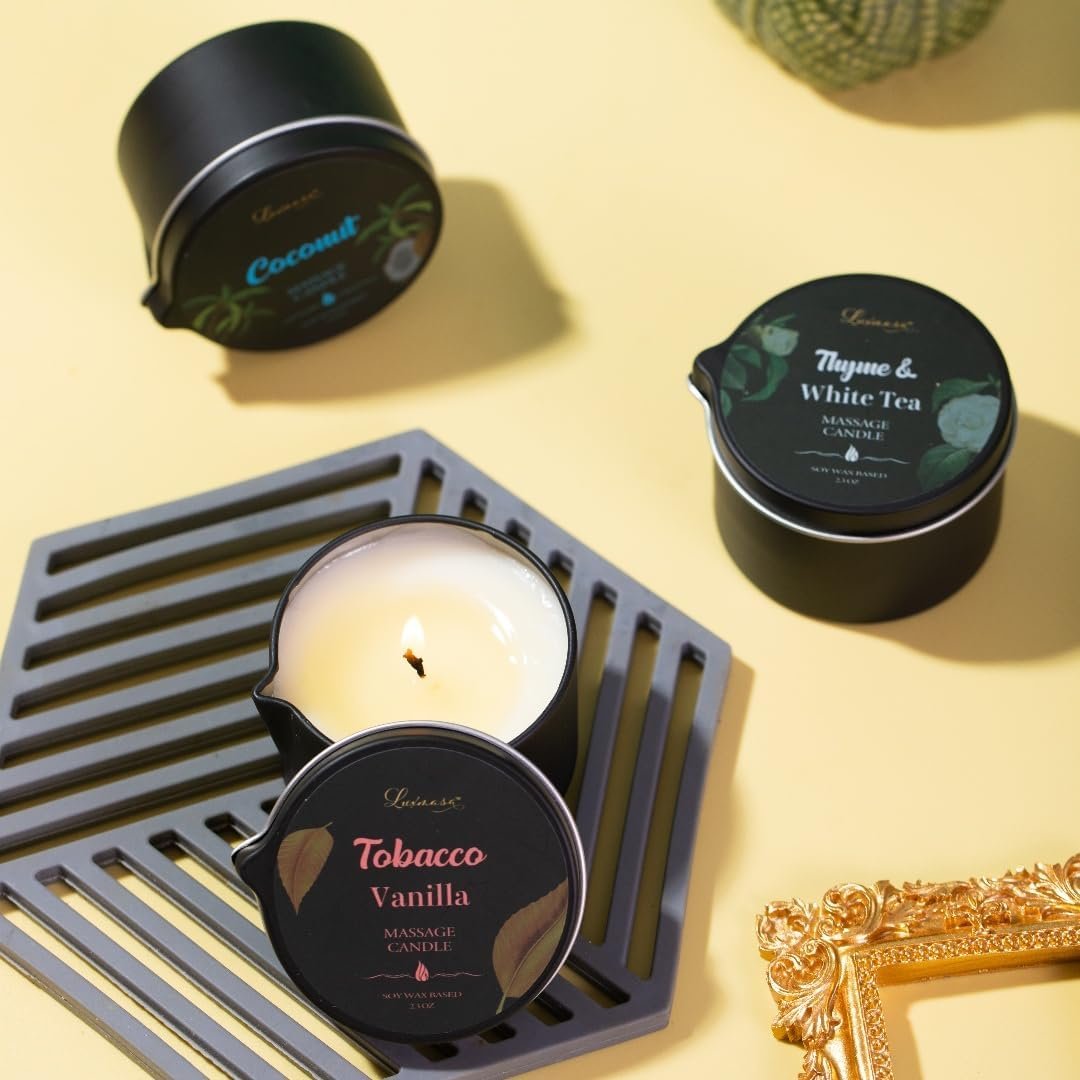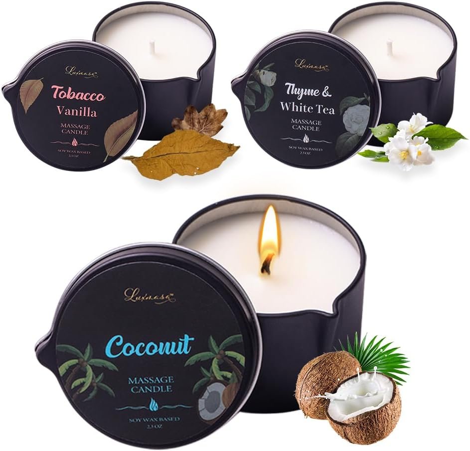 Massage Oil Candle 3 Pack,Coconut Oil Based-Daily Moisturizing Body Oil Relaxing-Natural Therapy Oil Scented Candle-6.9OZ (Coconut, Tobacco Vanilla, Thyme & White Tea)