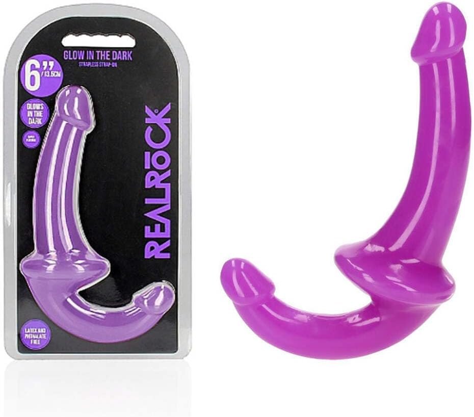 Ready for a GLOW IN THE DARK experience? Reach your finest climax in style with these beautifully shaped glow in the dark strapless strap-ons. Any light source will activate the fun. This strap on is suitable for anal and vaginal use! This sensational strap on requires no harness so nothing comes between you and your lover with the exception of your own intense pleasure together. All REALROCK GLOW IN THE DARK dildos are phthalate-free latex-free body-safe and non-porous which makes them easy-to-clean and gives them a longer lasting durability.This model stands 7.9″ (20 cm) tall has an insertable length of 5.3/4.3″ (13.5/11 cm) and has a girth of 1.2/1″ (3/2.5 cm).Dimensions package: 5.98″ x 4.49″ x 11.42″Weight package: 8.82 ozProduct dimensions: 7.87″Waterproof: YesSplashproof: YesPhthalate free: YesMaterials: TPESpecifications:DiameterBigger Dildo: 1.2″ / 3 cmSmaller Dildo: 1″ / 2.5 cmInsertable LengthBigger Dildo: 5.3″ / 13.5 cmSmaller Dildo: 4.3″ / 11 cm
