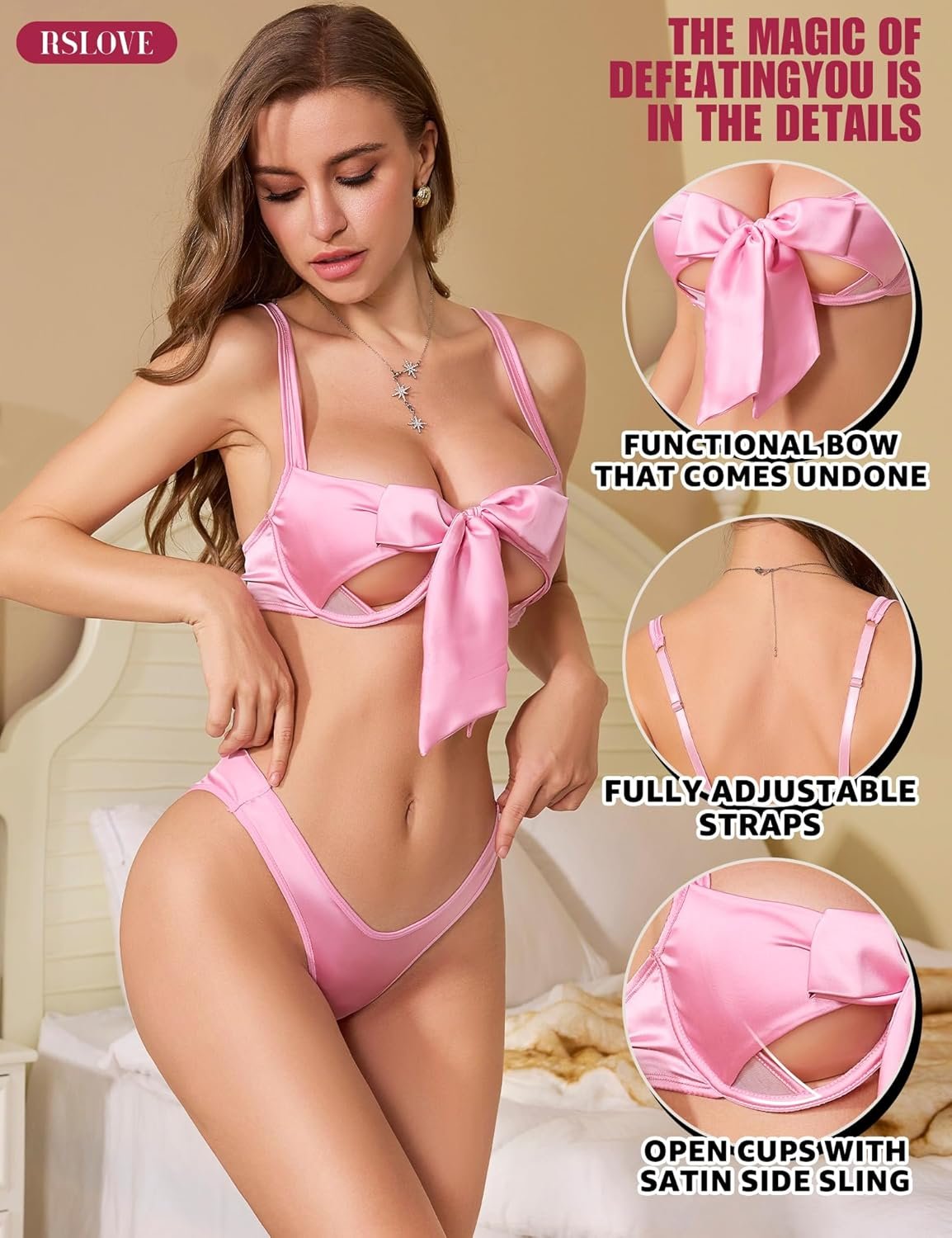 RSLOVE Lingerie Sets for Women Sexy – Satin Bow Underwire Bra and Panty Sets 2 Piece Underwear Lingerie Outfits