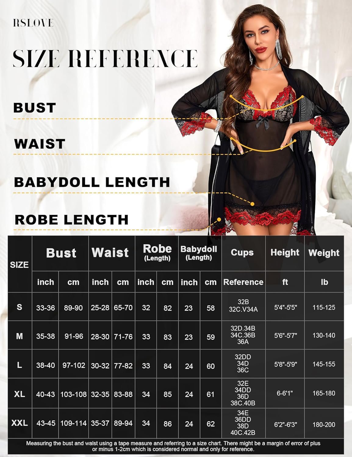 RSLOVE Women Sexy Lingerie Set 3 Piece Babydoll & Lace Kimono Robe Strap Chemise Sleepwear Mesh Nightgown