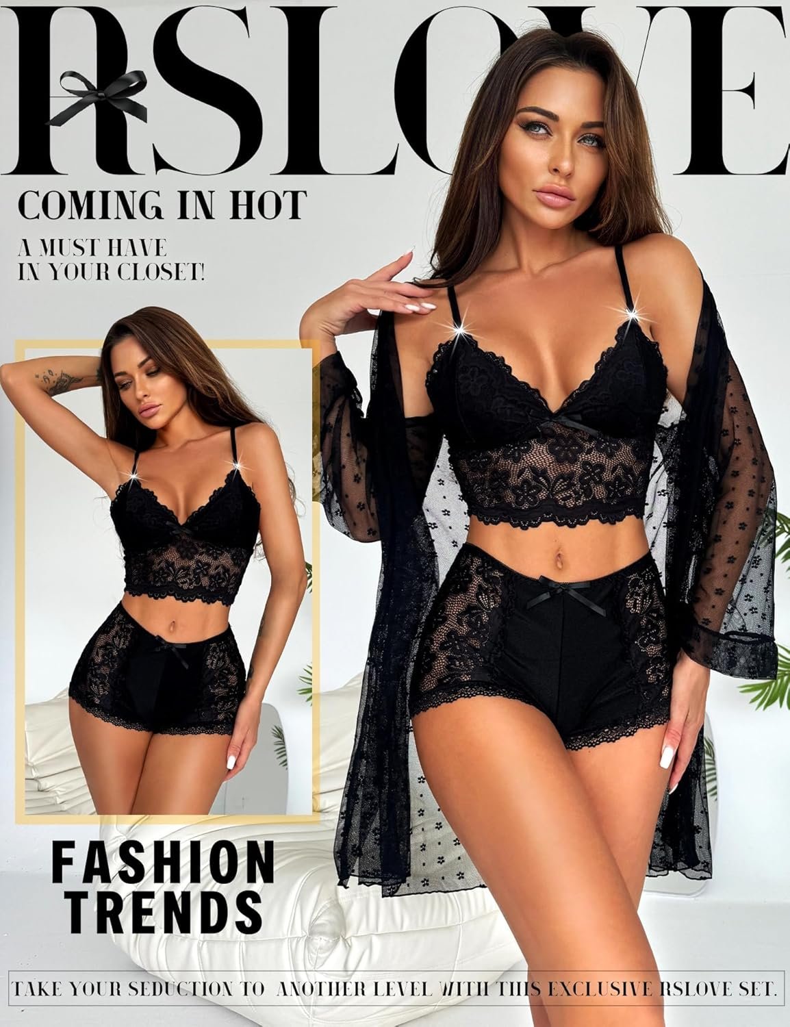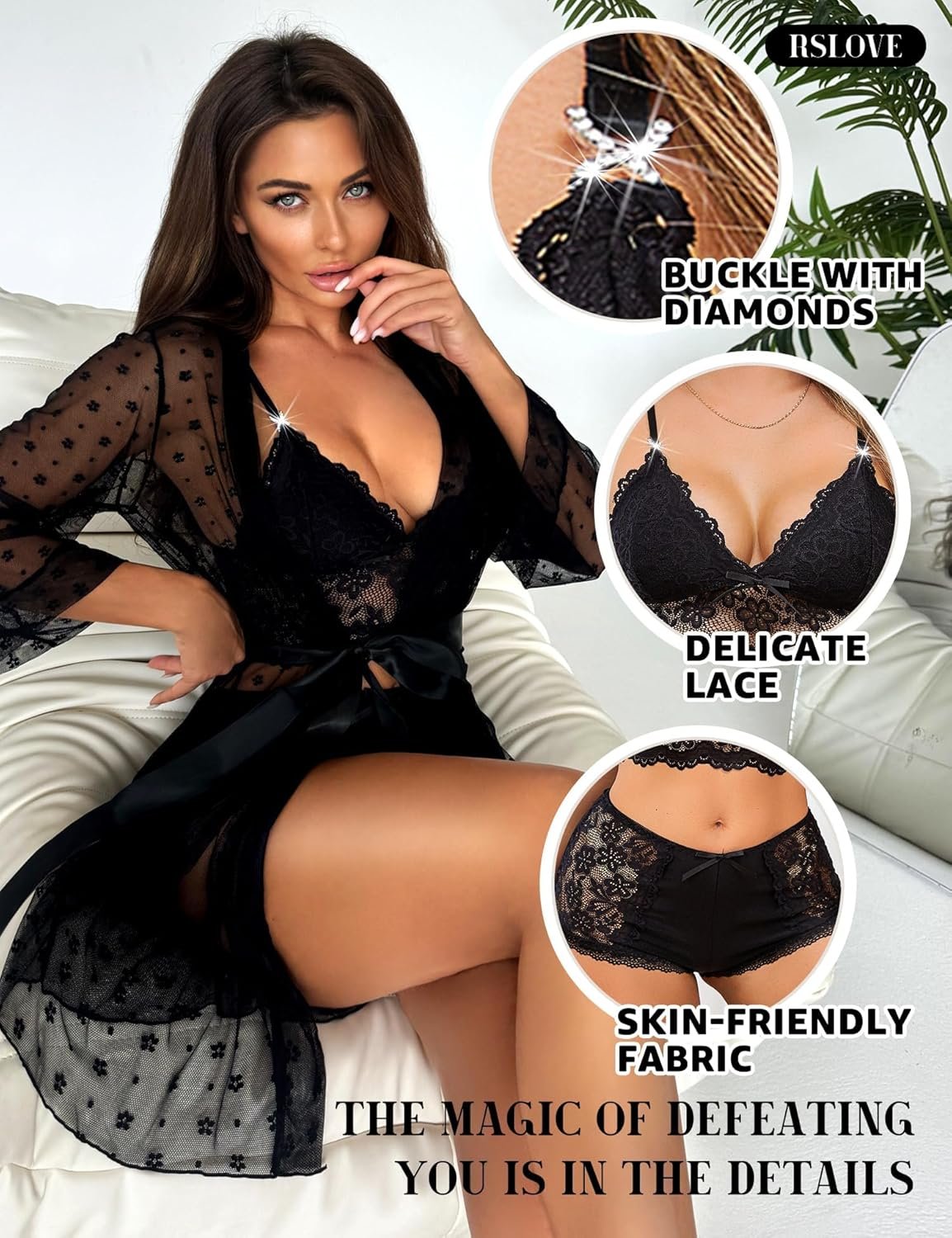 RSLOVE Women Sexy Lingerie Set – 3 Piece Lace Bra and Panty Sets with Mesh Kimono Robe Nightgown Sleepwear
