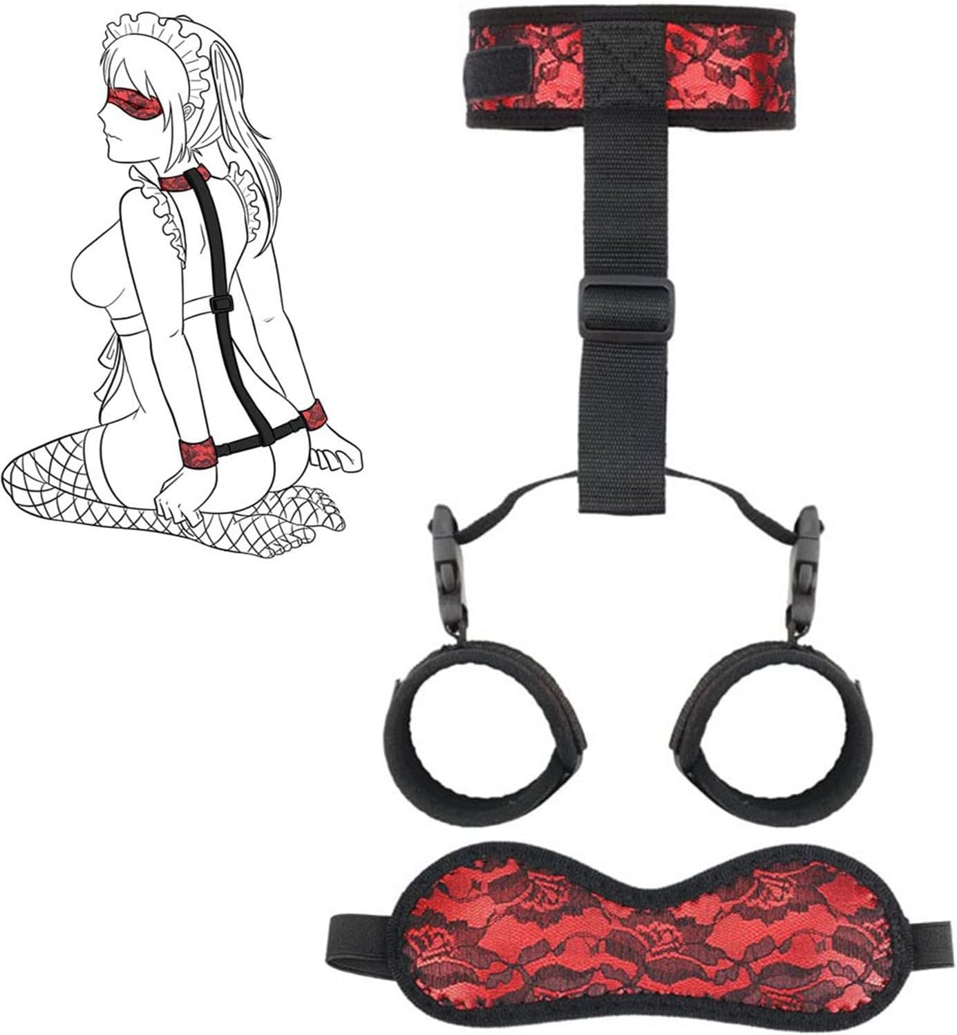 Multi-functional equipment: the product is equipped with a pair of neck collars, a pair of handcuffs, an erotic eye mask. The appearance of the red background color with black lace pattern design, compared with the ordinary style is more sexy and seductive, the collar, handcuffs, eye mask of the short fluffy lining, smooth to the touch, back and handcuffs between the connection between the bondage belt can be freely adjusted, better control of the bondage posture, put on the eye mask, amplify all the sensory stimulation, immersion in the enjoyment of the fun of bondage.