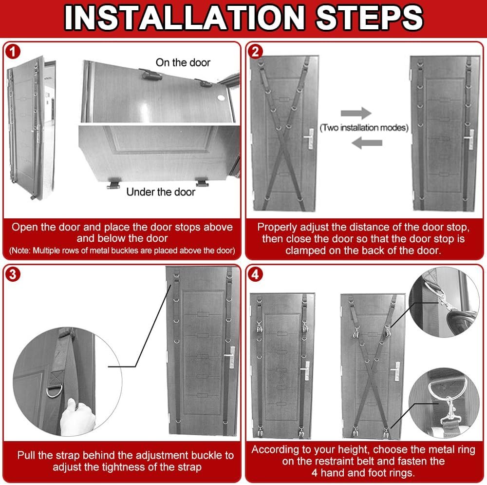Adjustable height and length: The erotic door swing conveniently fits over most standard doors, each part of the door swing is adjustable, easy to adjust the length and tightness of wrist and ankle, perfect fit for you and your lover. allowing you to set up your play space quickly and easily, different position can shape different postures, and be easier G-Spot stimulation.