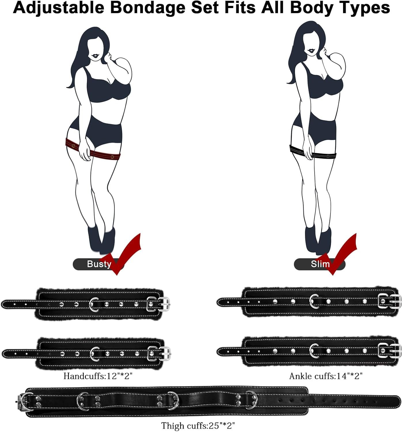4 pcs Bondage Set for Couples SM Games – BDSM Kit includes handcuffs, ankle cuffs, thigh cuffs, and cross straps. The cuffs can be combined in various ways to create more than 15 restraint methods.It’s an excellent option for those new to BDSM or experienced enthusiasts alike.