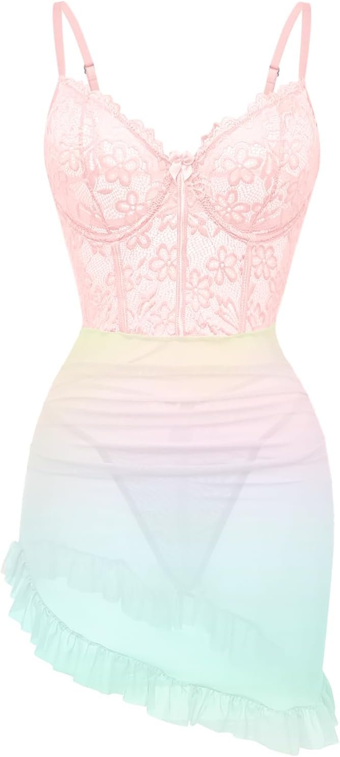 Sexy Corset Bodycon Ruffle Sheer Underwire Mesh Lace Floral Outfits Babydoll Lingerie Set Dress with Thong 2 Piece