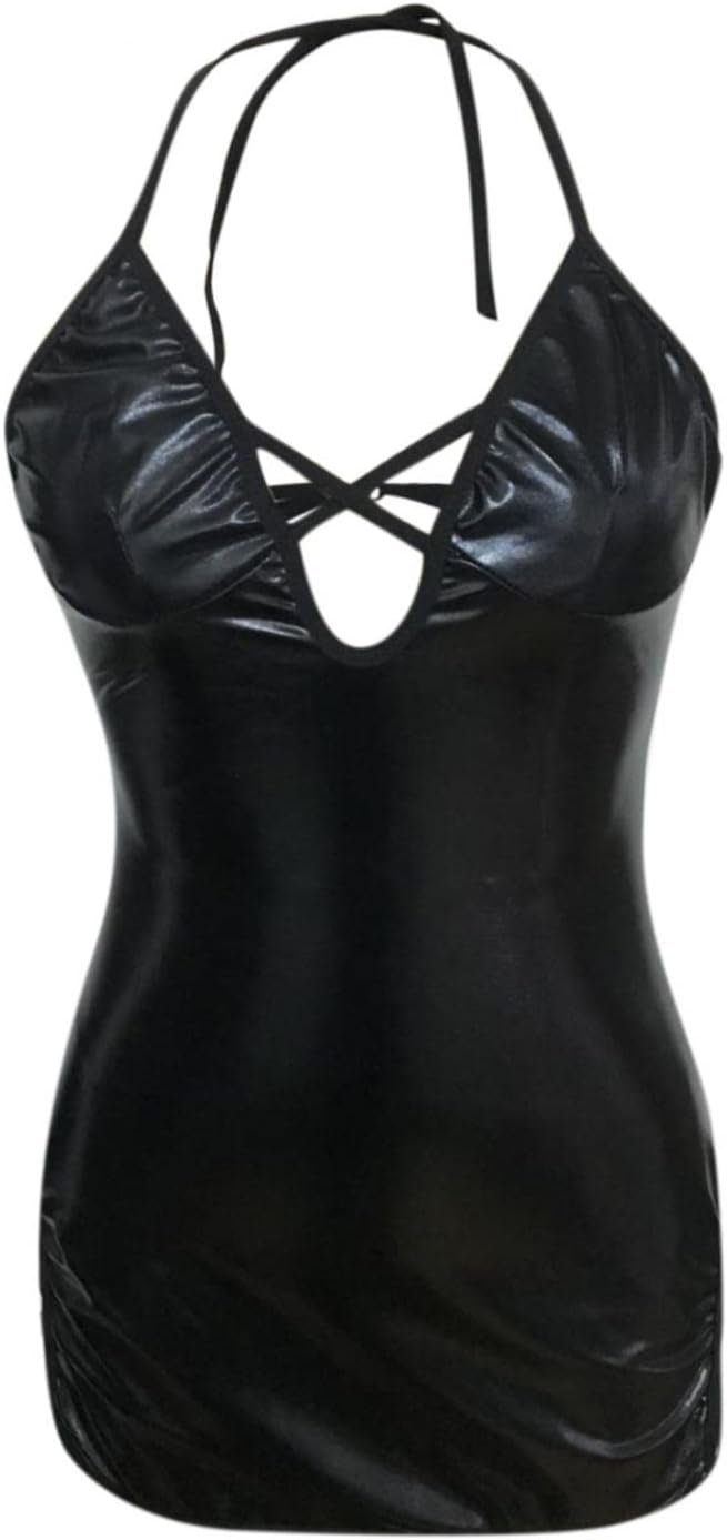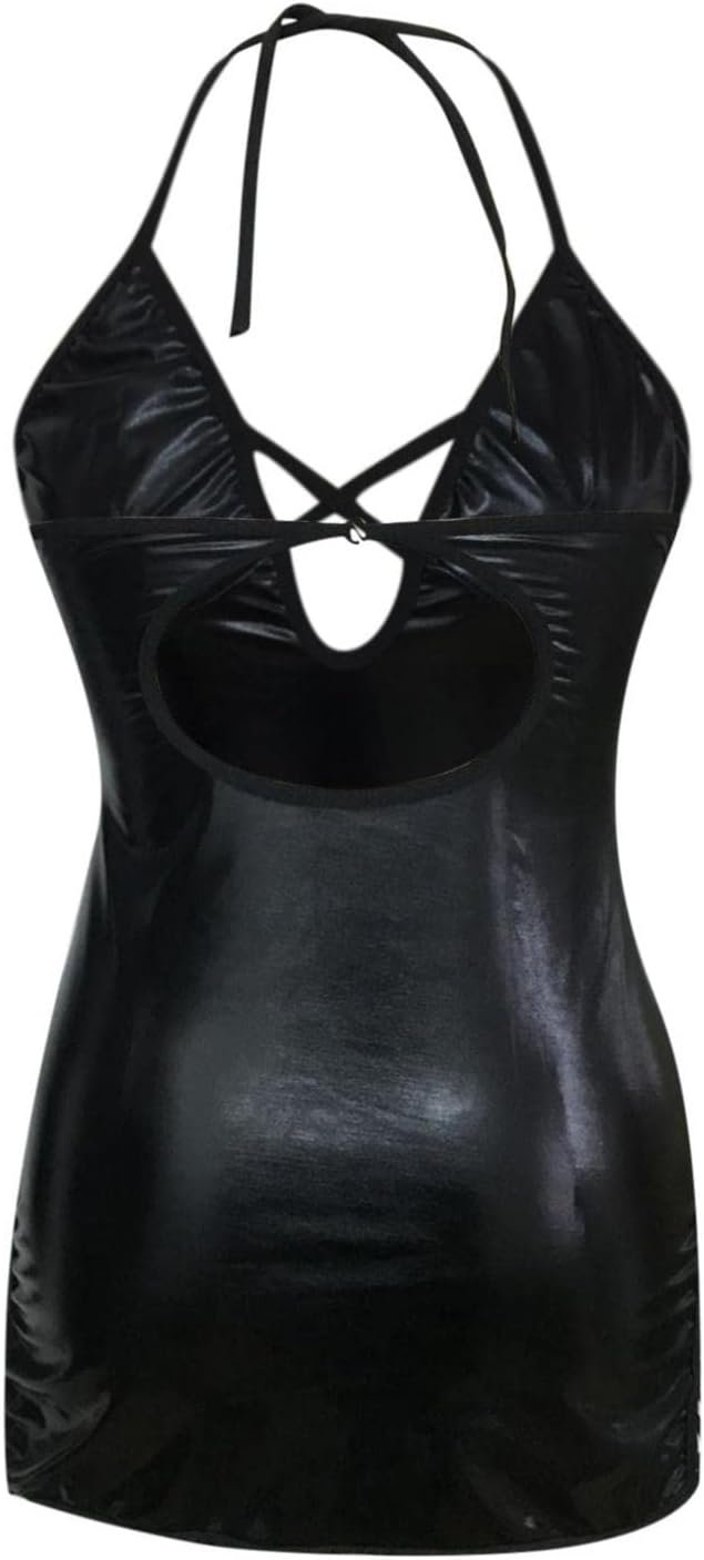 Sexy Leather Dress Lingerie for Women Strap Mesh Babydoll V Neck Sleepwear See Through Teddy Chemise Nightwear