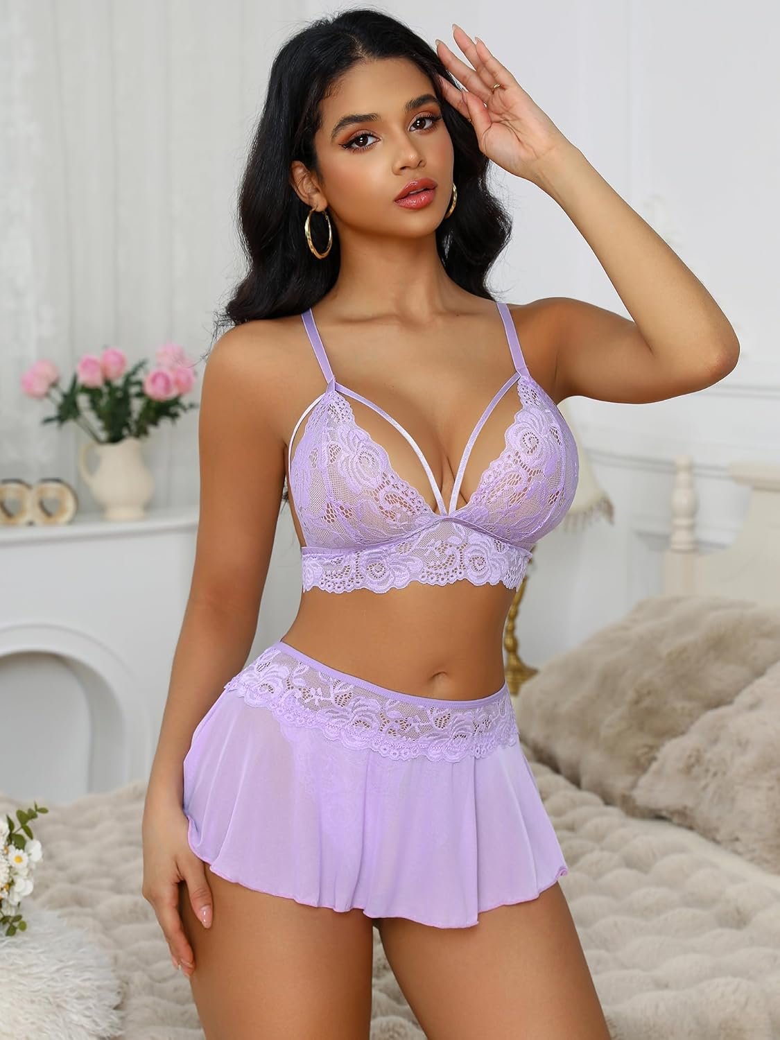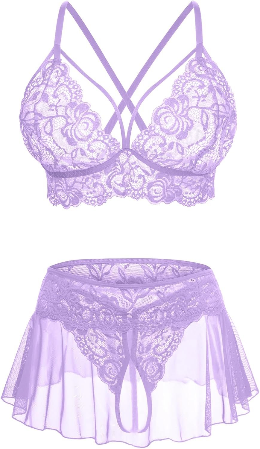Sexy Lingerie for Women Naughty 3 Piece Lace Bralette, Mini Skirt with G-String Crotchless Lingerie Outfits