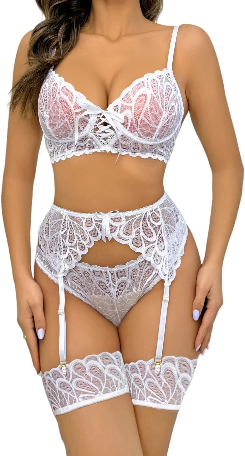 Sexy Lingerie for Women,3 Piece Lace Lingerie Set Bra and Panty Sets with Garter Belt Babydoll Teddy