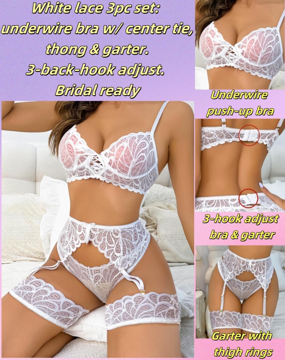 White lace 3pc set: underwire bra w/ front tie, thong & garter. 3-back-hook adjust. Perfect for bridal nights
