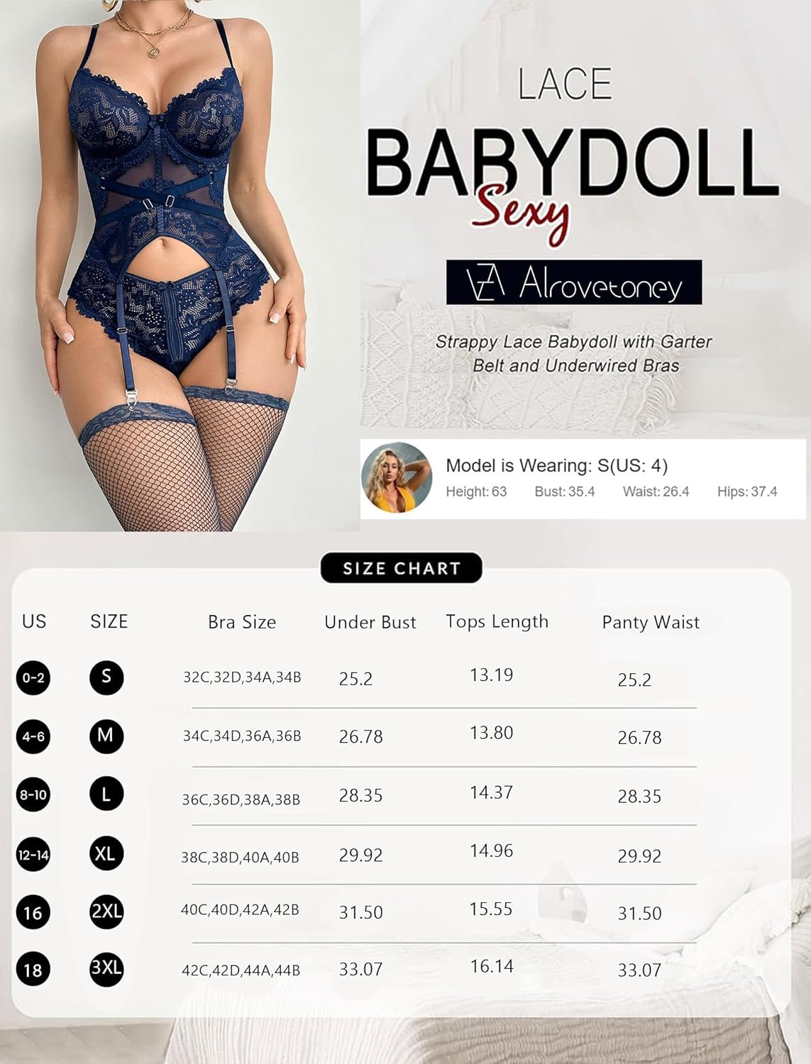 Sexy Lingerie Set 4pcs Teddy Bodysuit With Bra And Panties & Thigh Highs, Spliced With Decorative Ribbon S-2XL