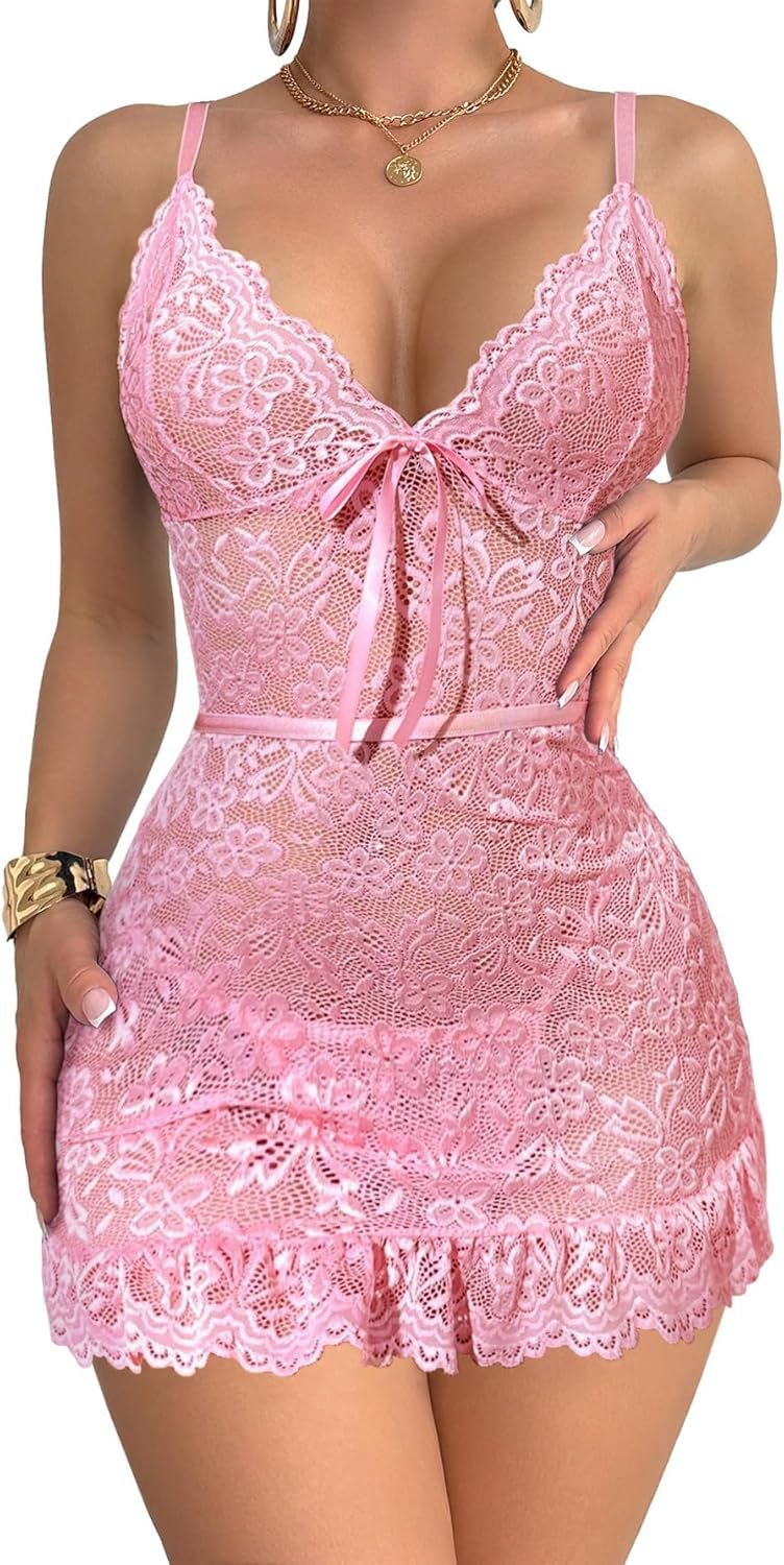Sexy Sheer Mini Bodycon Babydoll Lace Lingerie Set Sleep Dress with Thong 2 Piece Outfits