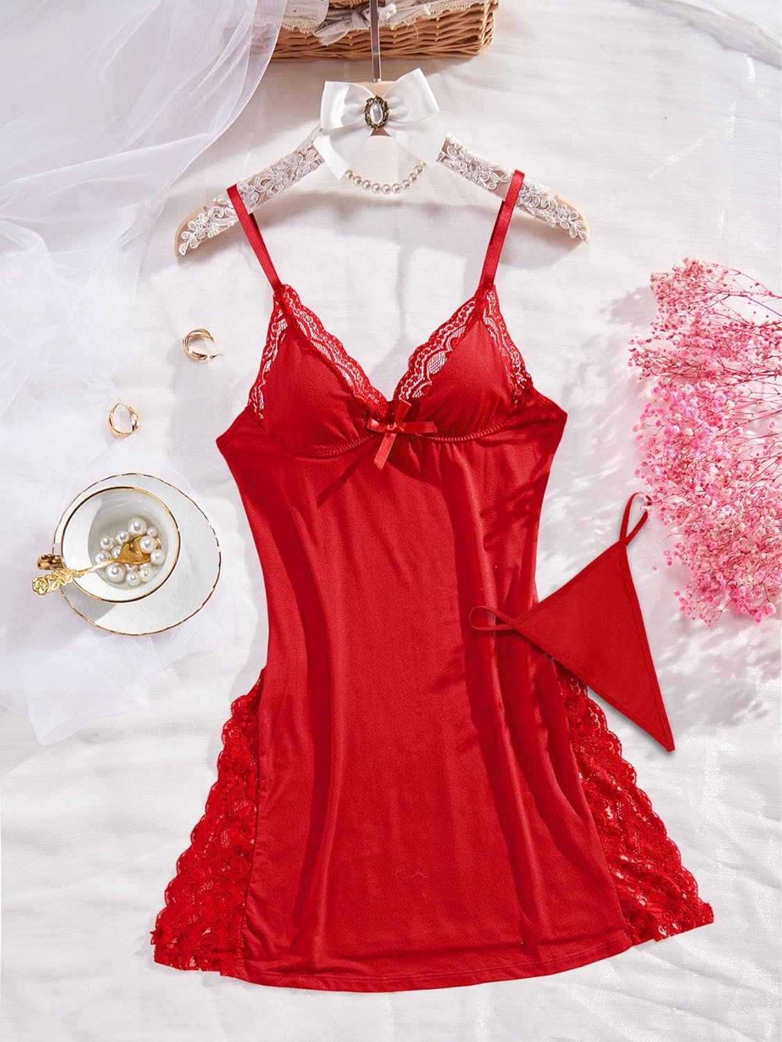 Sexy Split Side Floral Lace Trim Full Slip Night Gown Babydoll Lingerie Dress with Thong 2 piece