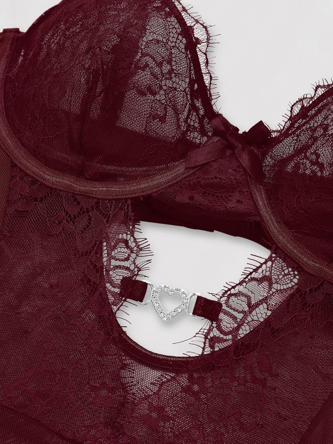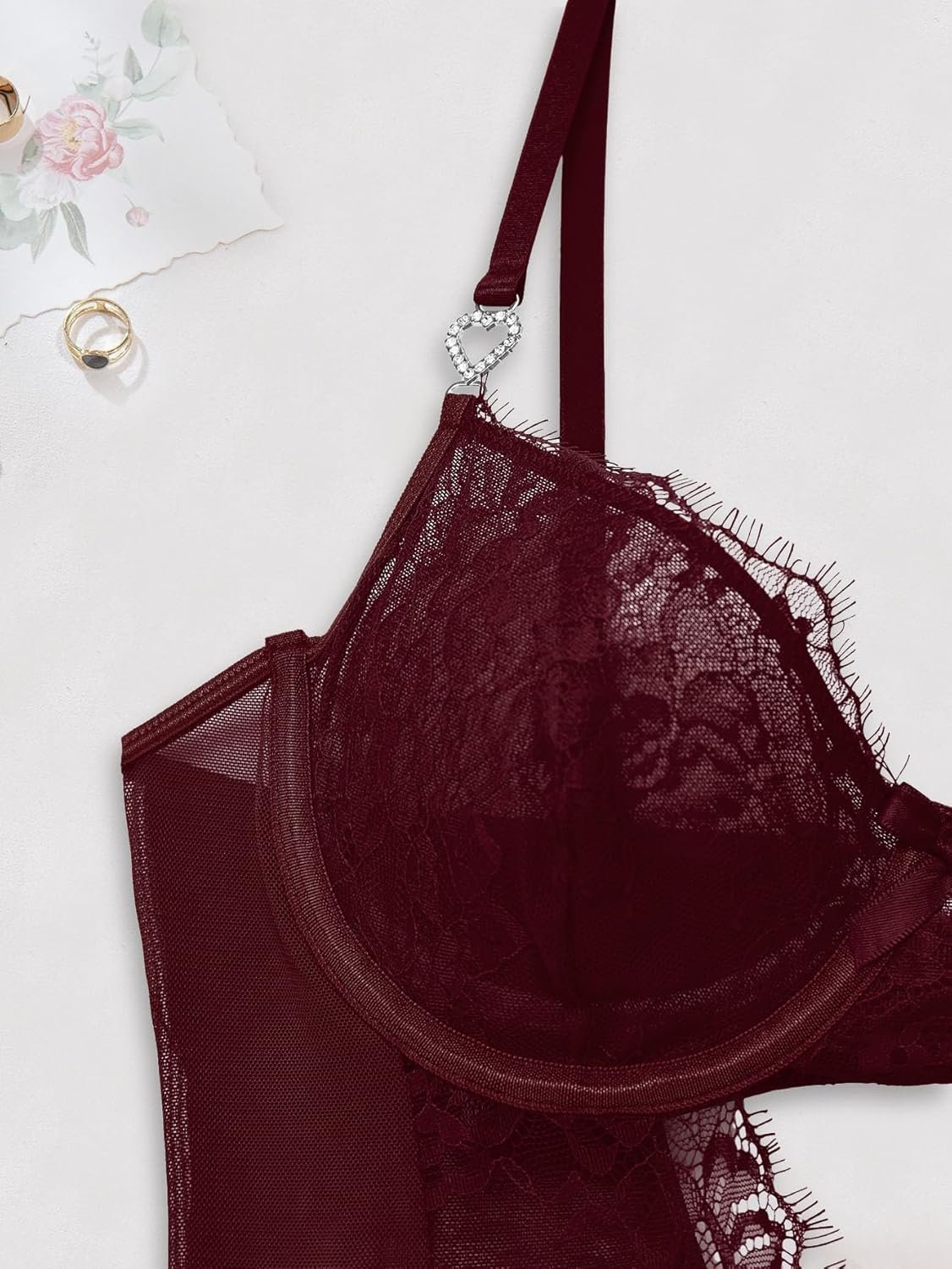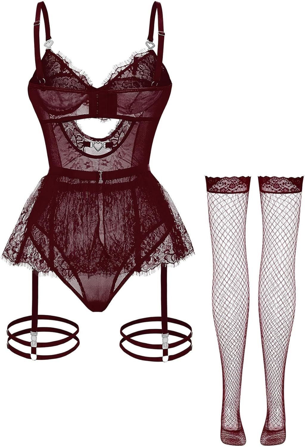 Sexy Stocking Underwire Push Up Rhinestones Heart Floral Lace Mesh Sheer Garter Bodysuit Skirt Lingerie Set 3 Piece