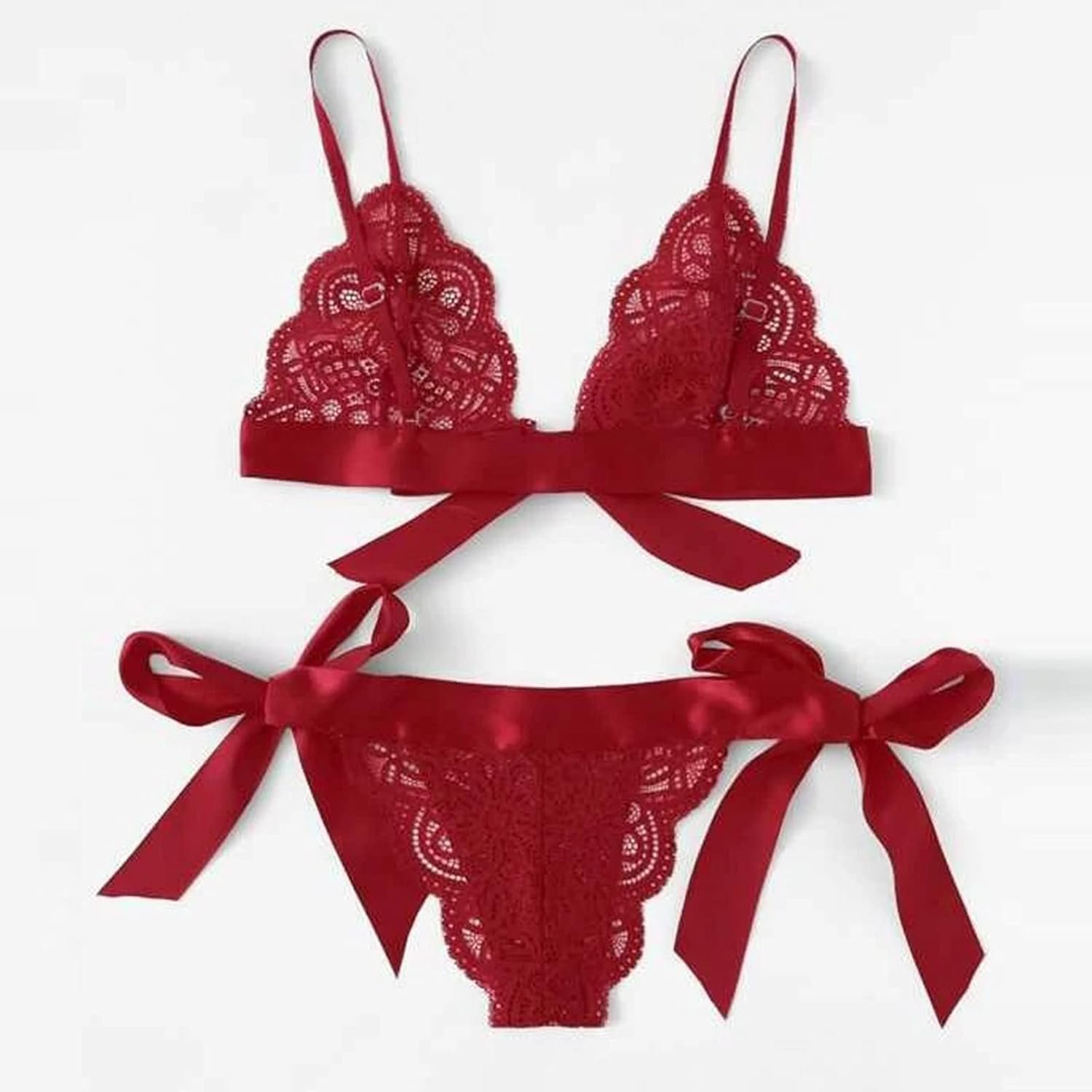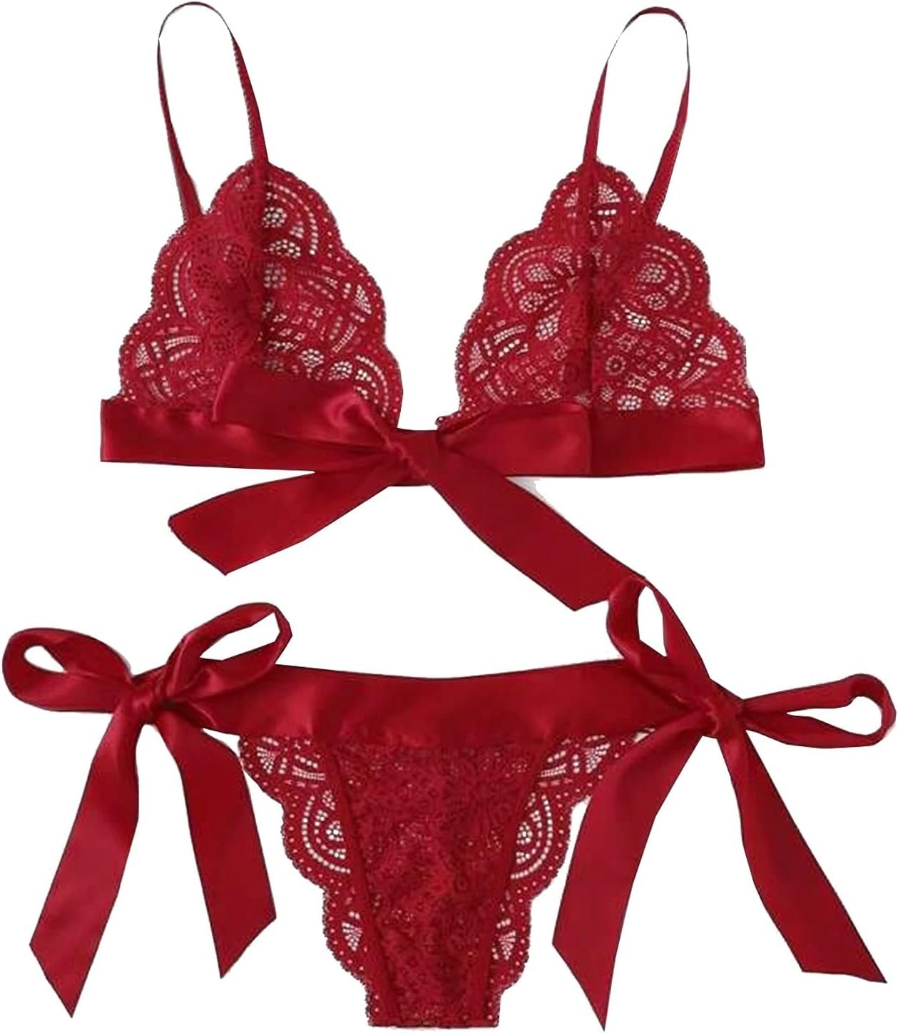 Sexy Underwire Push Up Scallop Floral Lace Sheer Lingerie Set for Women Bow Tie Bra and Panty 2 Piece Christmas