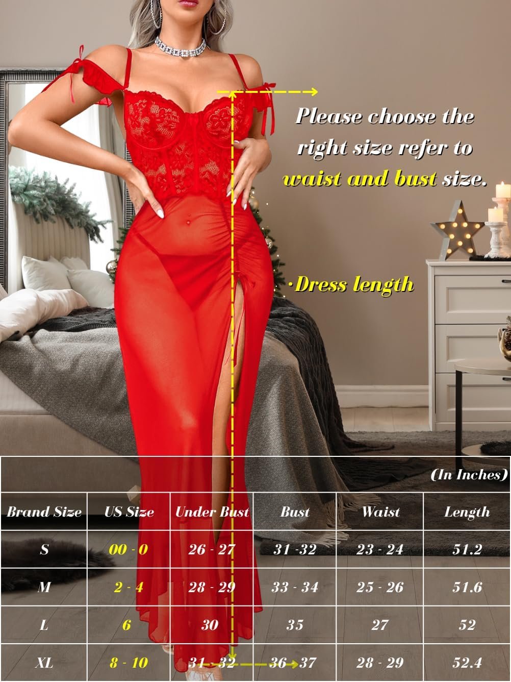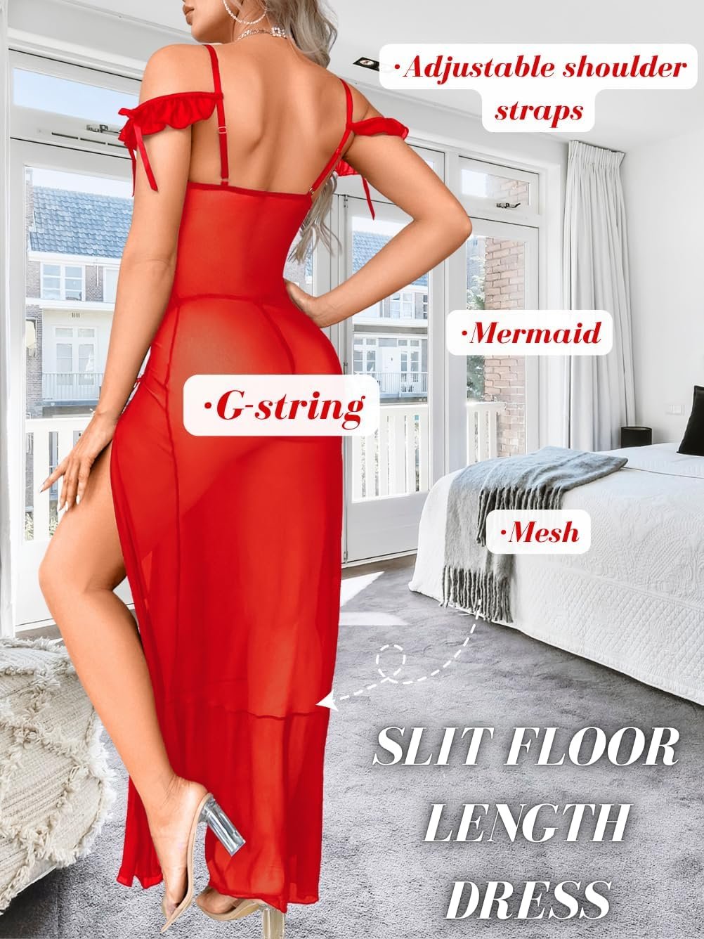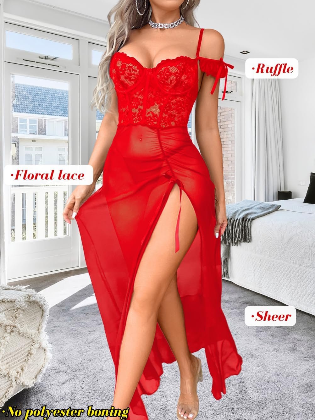 Sheer Mesh Lingerie Dress, Lace High Slit Ruffle, Valentines Day, Sexy Date Night G String Nightgowns Bow