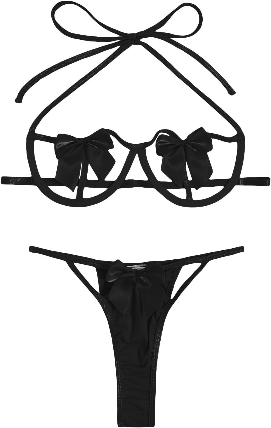 SOLY HUX Women’s Two Piece Underwire Lingerie Set Bow Knot Cut Out Halter Bra and Panty Sleepwear