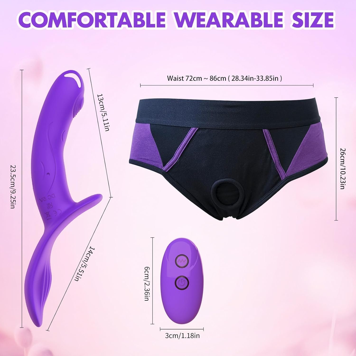 UNIQUE DESIGN: With the anti-collision buffer design at the front of the fake penis, there is no hurt to your receiver’s vagina or anus. The penetration size of dildo is 13x3cm(5.11×1.18in), the panties for wearer is in size S, suits for waist size from 72~86cm(28.3~33.8in)