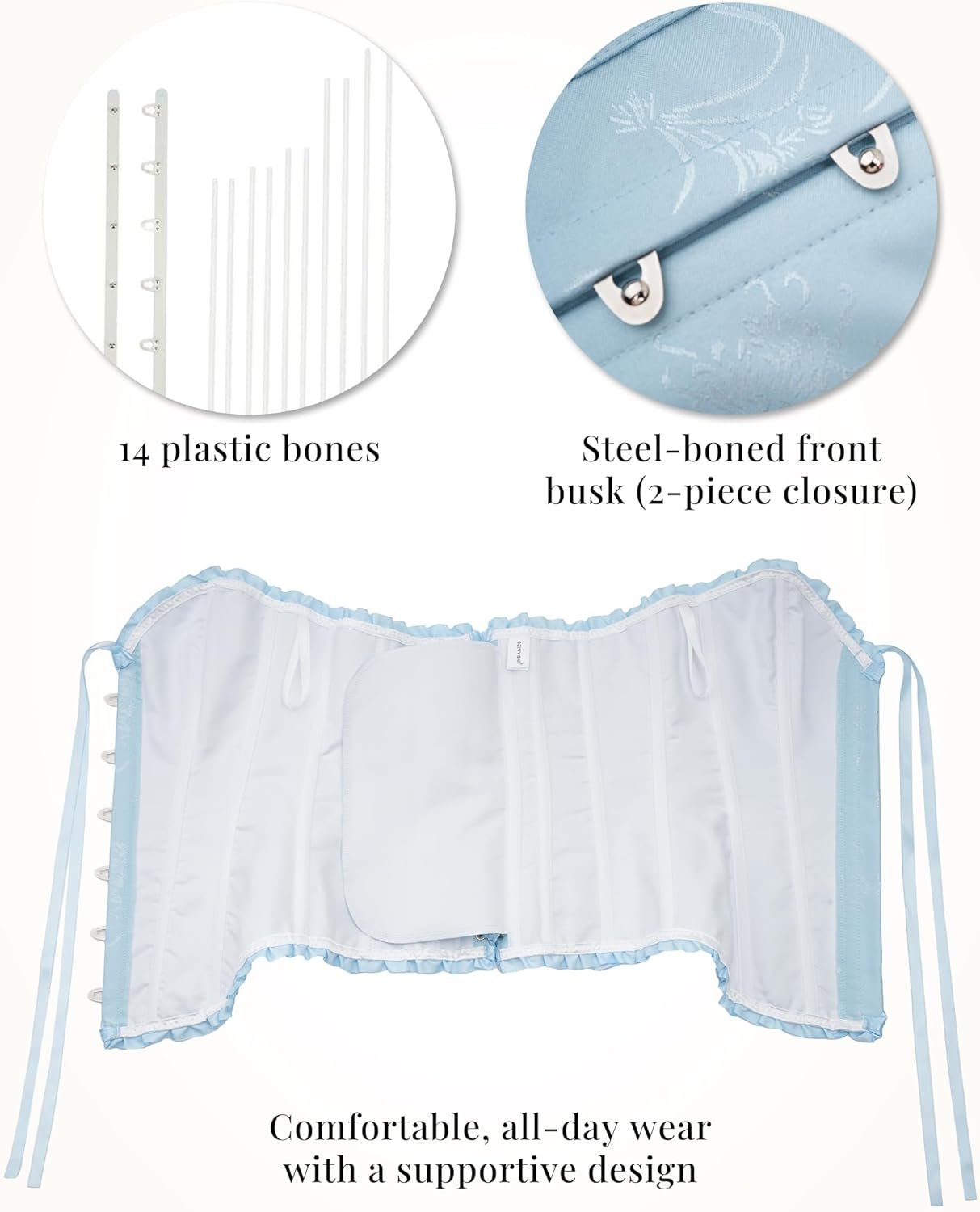 Customers find the corset gorgeous, well-made, and comfortable, with one noting it doesn’t look cheap or inexpensive. It fits great and offers good value for money, being surprisingly sturdy for its price. The size receives mixed feedback – while some say it’s true to size, others mention it runs small and isn’t suitable for small-chested individuals. Customers disagree on how easy it is to put on, with some finding it difficult to get on and off. The clasp tightness is also mixed, with some saying it tightens nicely while others find it hard to clip.