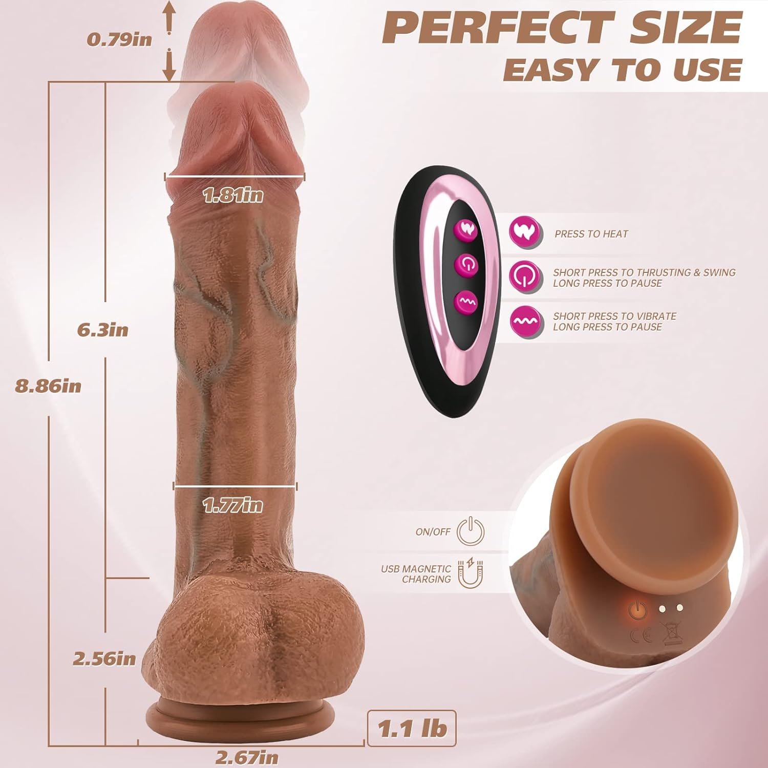 【7 Thrusting Swings And 10 Vibration Modes】VOILTY thrusting dildo has 5 functions including thrusting, swing, vibrating, heating, and remote control. The upgraded motor provides it with more powerful energy and allows it to operate without noise. By using the remote control, you can enjoy 7 thrusting swings and 10 vibration modes separately, bring super sexual pleasure to your G-spot and clitoris. Even if don’t use these functions, this adult toy is still good suction cup dildo or anal sex toy.
