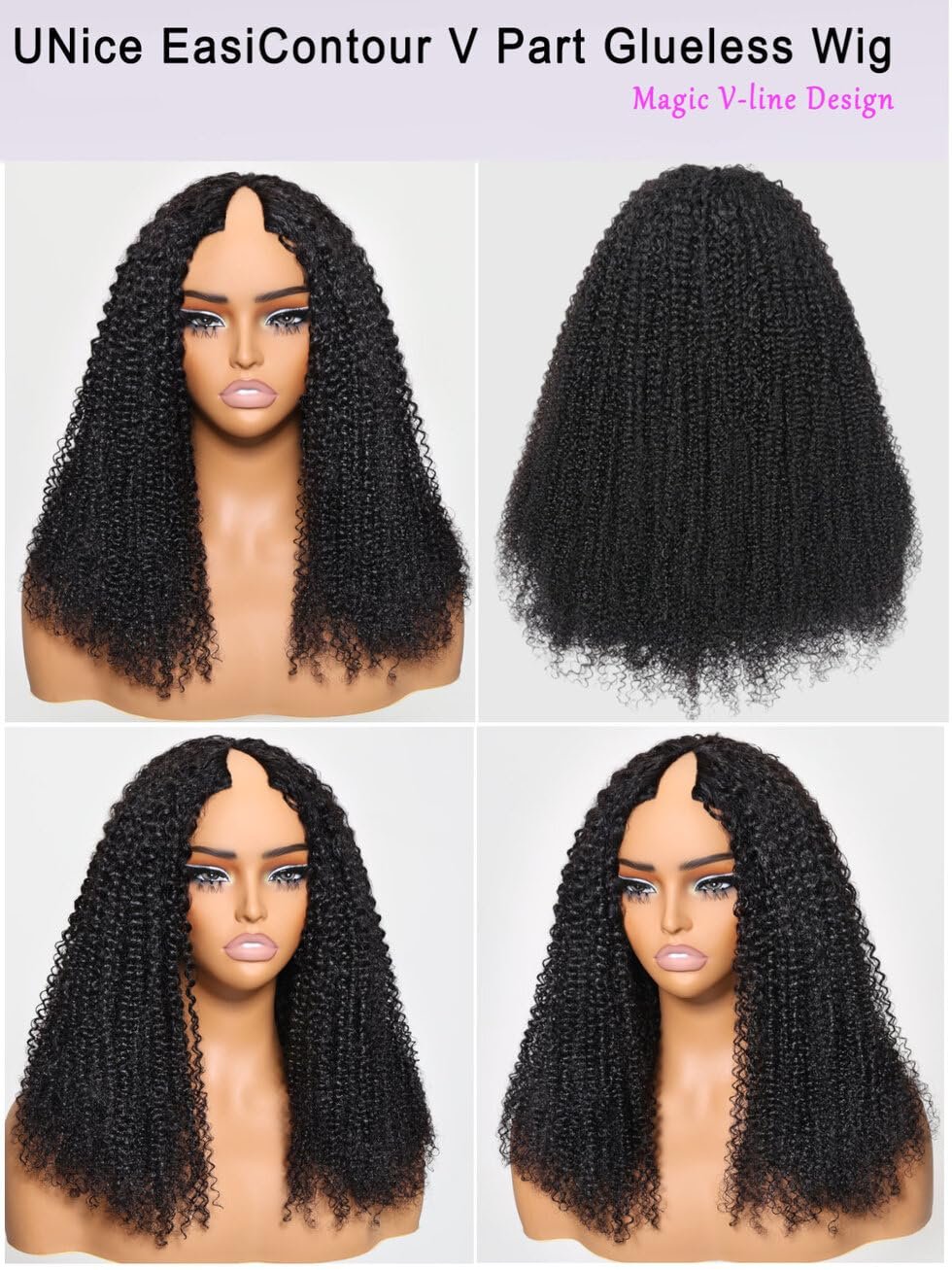 2.Features: Kinky curly v part Wig can blend your natural hair well. Breathable & Comfortable. No Glue & No Sew In. No Stocking Cap Needed. Wear & Go. Super Secure.