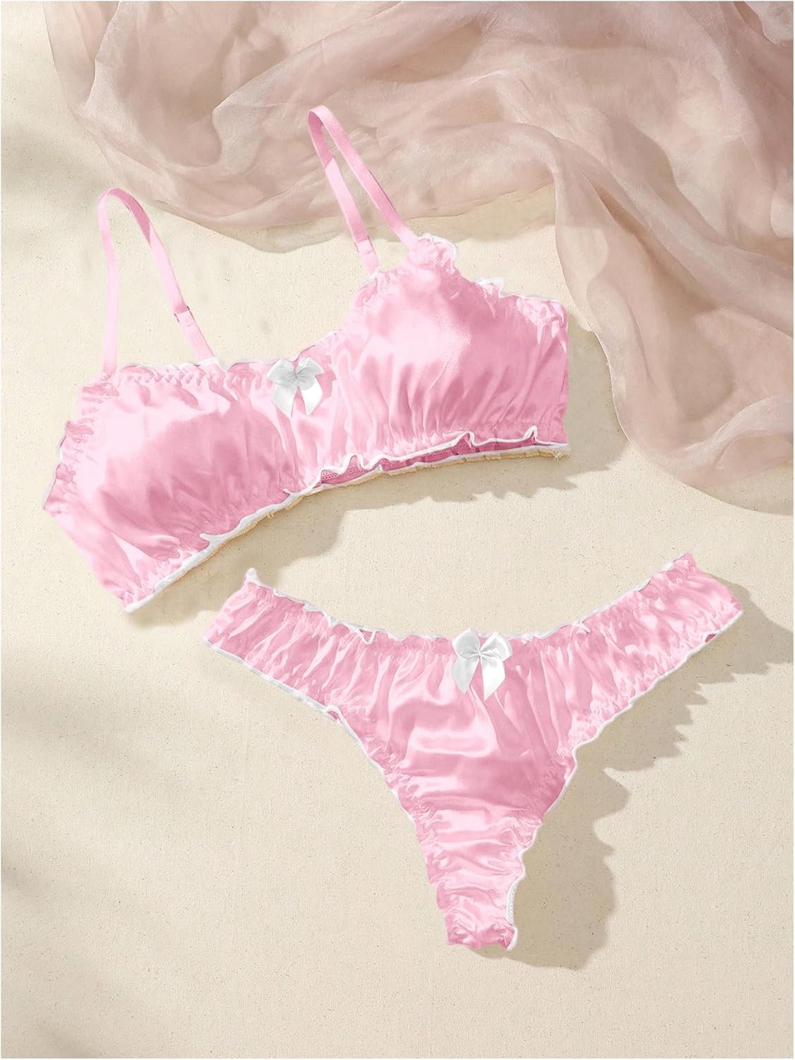 Verdusa Women’s Satin Lingerie Set Sexy Lettuce Trim Bow Bra and Thong Sets