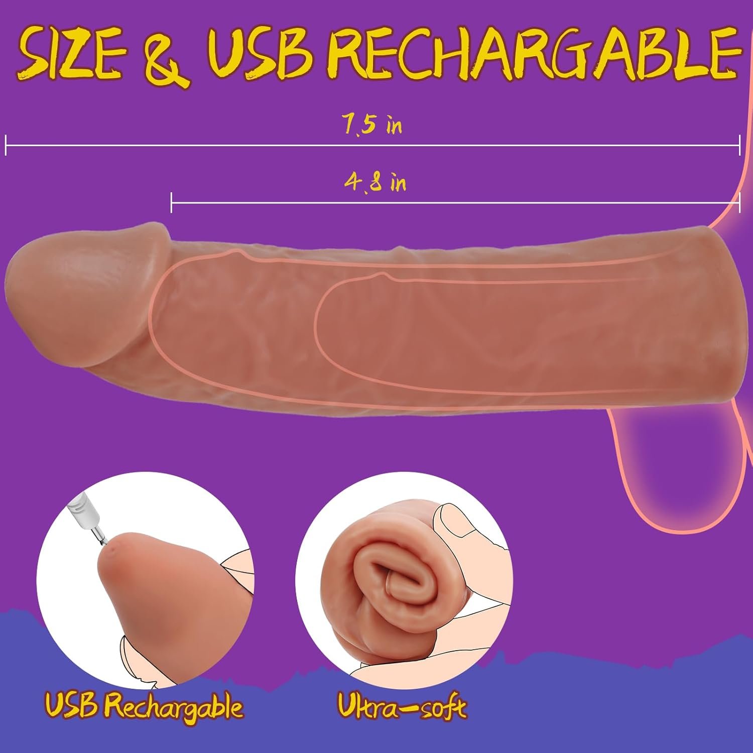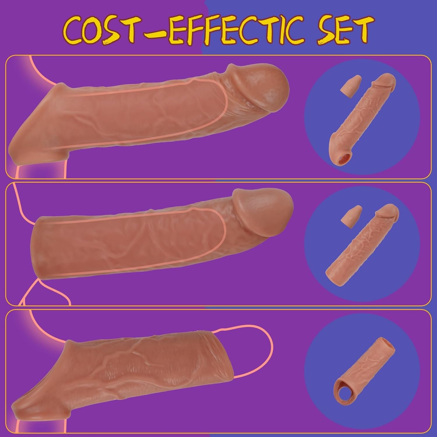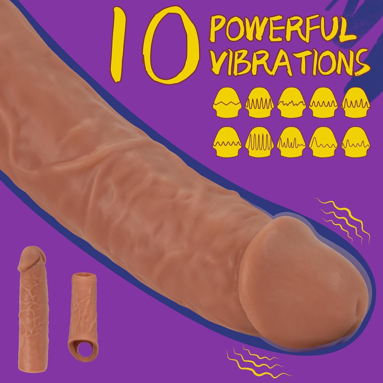 Vibrating Male Sex Toys Penis Extender Sleeve Set—Detachable Cock Sleeve Vibrator with 10 Vibrations, Realistic Penis Ring for Men Couples Penis Enlargement, Prolonged Erection – Brown Kit
