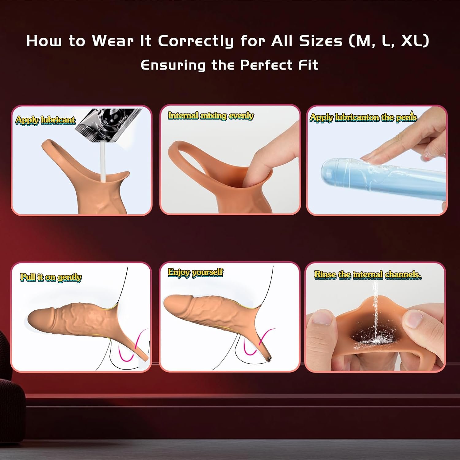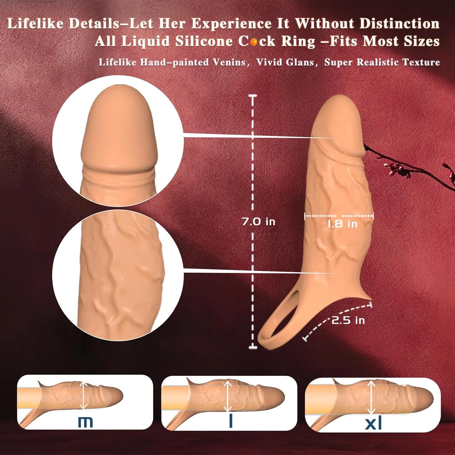 All Liquid Silicone – Soft and Elastic for Most Sizes – Made entirely of liquid silicone, this penis sleeve features a stretchable cock ring that easily adjusts to your size. The front sleeve extends your penis by 2.6 inches for deeper penetration.