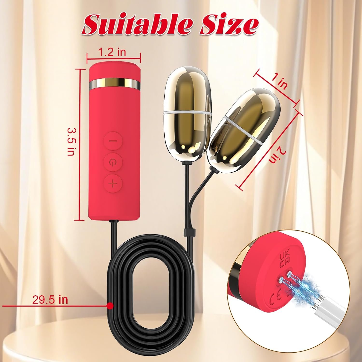 Hi, the length of the remote to the egg vibrator is 29.5 inches and the maximum distance the two egg vibrators can be separated is 19.7 inches